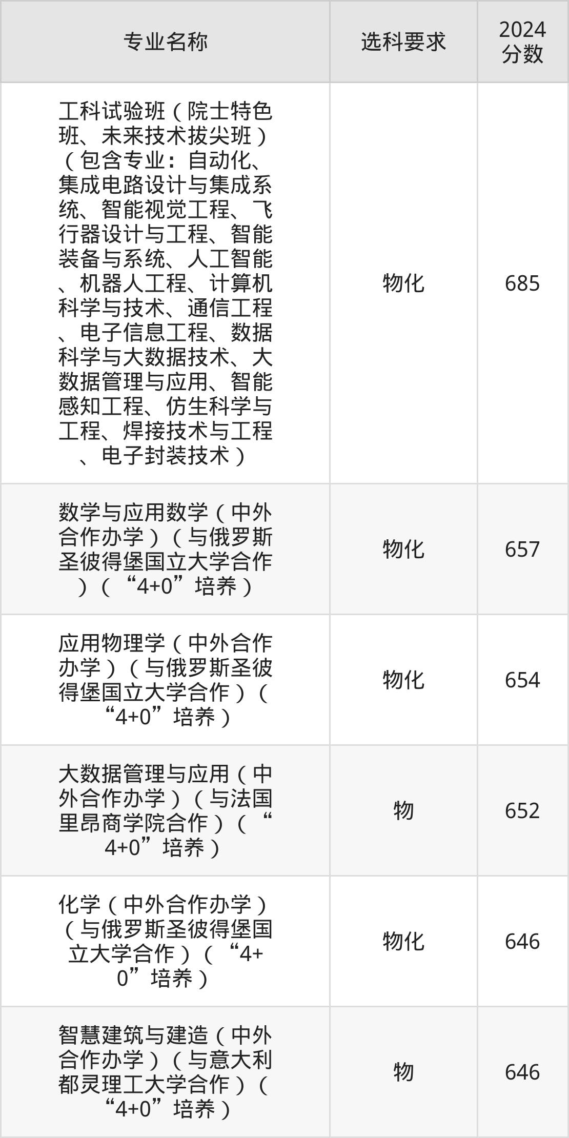 | 工科试验班(院士特色 班)(包含专业:自动 化、集成电路设计与集 成系统、智能视觉工程 、飞行器设计与工程、 智能装备与系统、人工 智能、机器人工程、计 算机科学与技术、通信 工程、电子信息工程、 数据科学与大数据技术 、大数据管理与应用、 智能感知工程、仿生科 学与工程、焊接技术与 工程、电子封装技术) | 物化 | 673 |