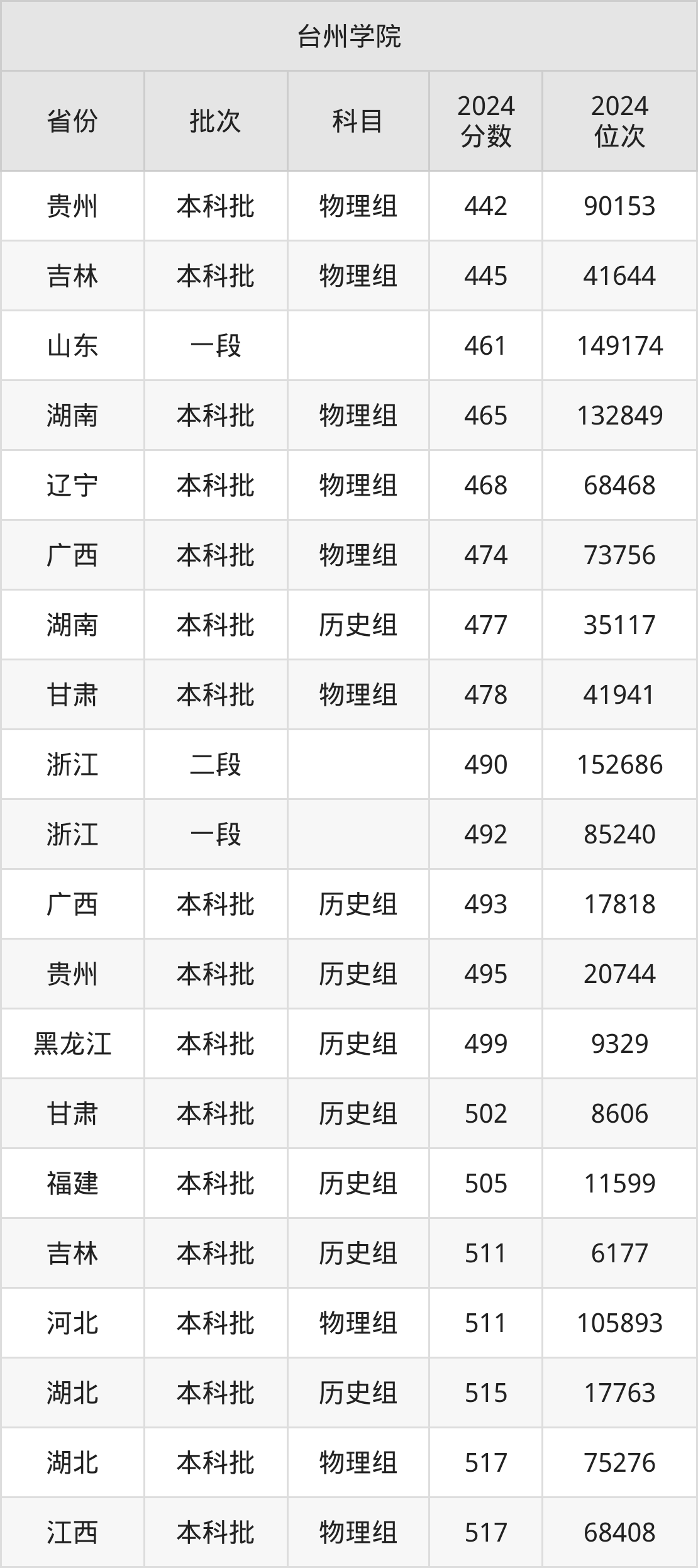 在贵州本科批物理组,台州学院的最低分是442、最低录取位次是90153名。在吉林本科批物理组,台州学院的最低分是445、最低录取位次是41644名。