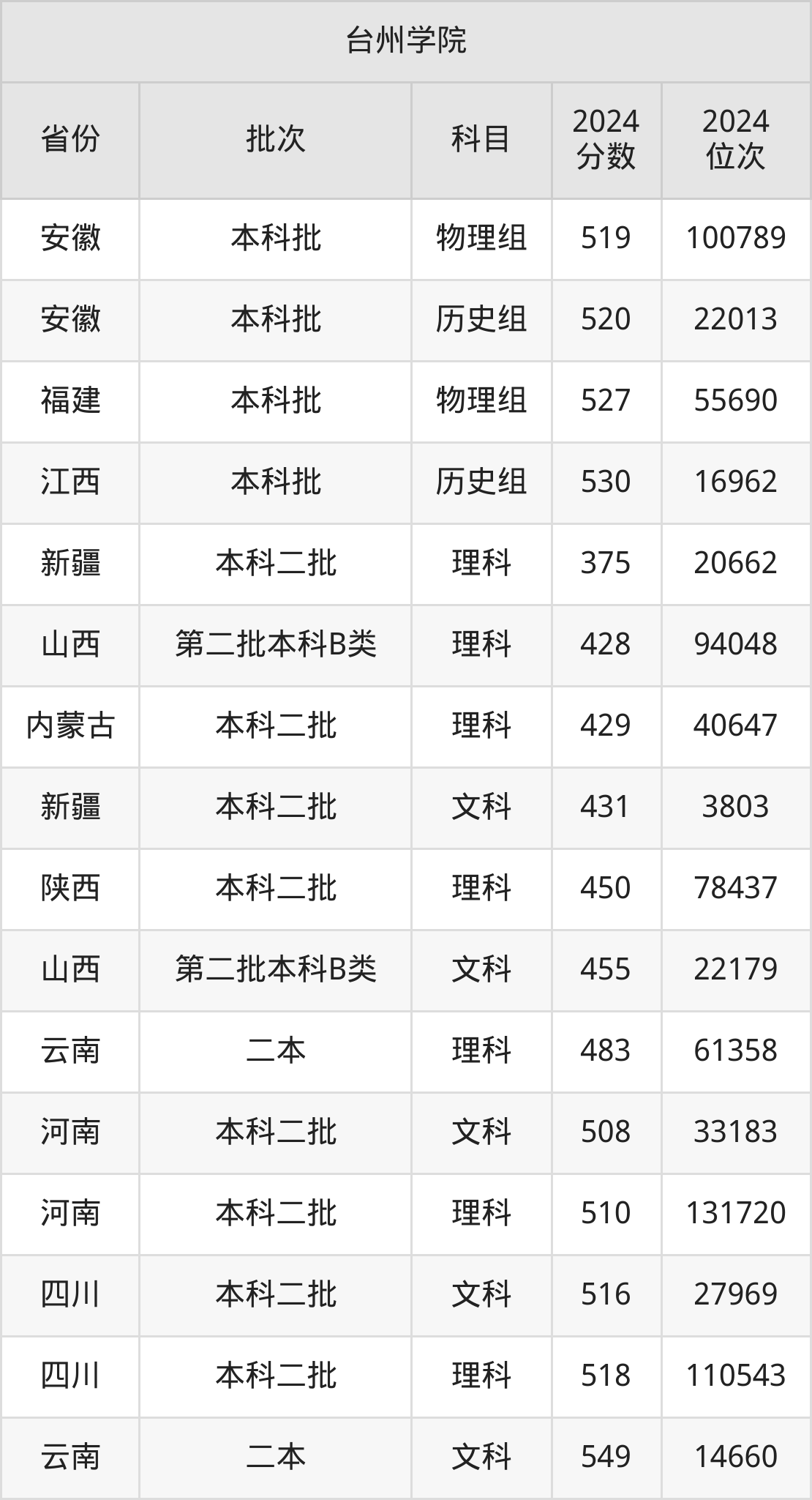 圆梦小编为2025届想要报考台州学院的同学整理了:台州学院2024年在全国21个省的最低分及录取位次。