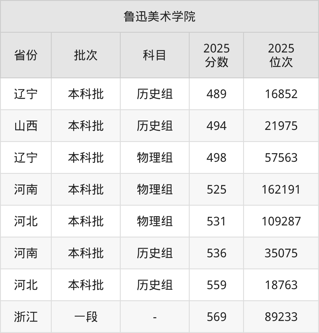 圆梦小编为2026届想要报考鲁迅美术学院的同学整理了:鲁迅美术学院2025年在全国5个省的最低分及录取位次。