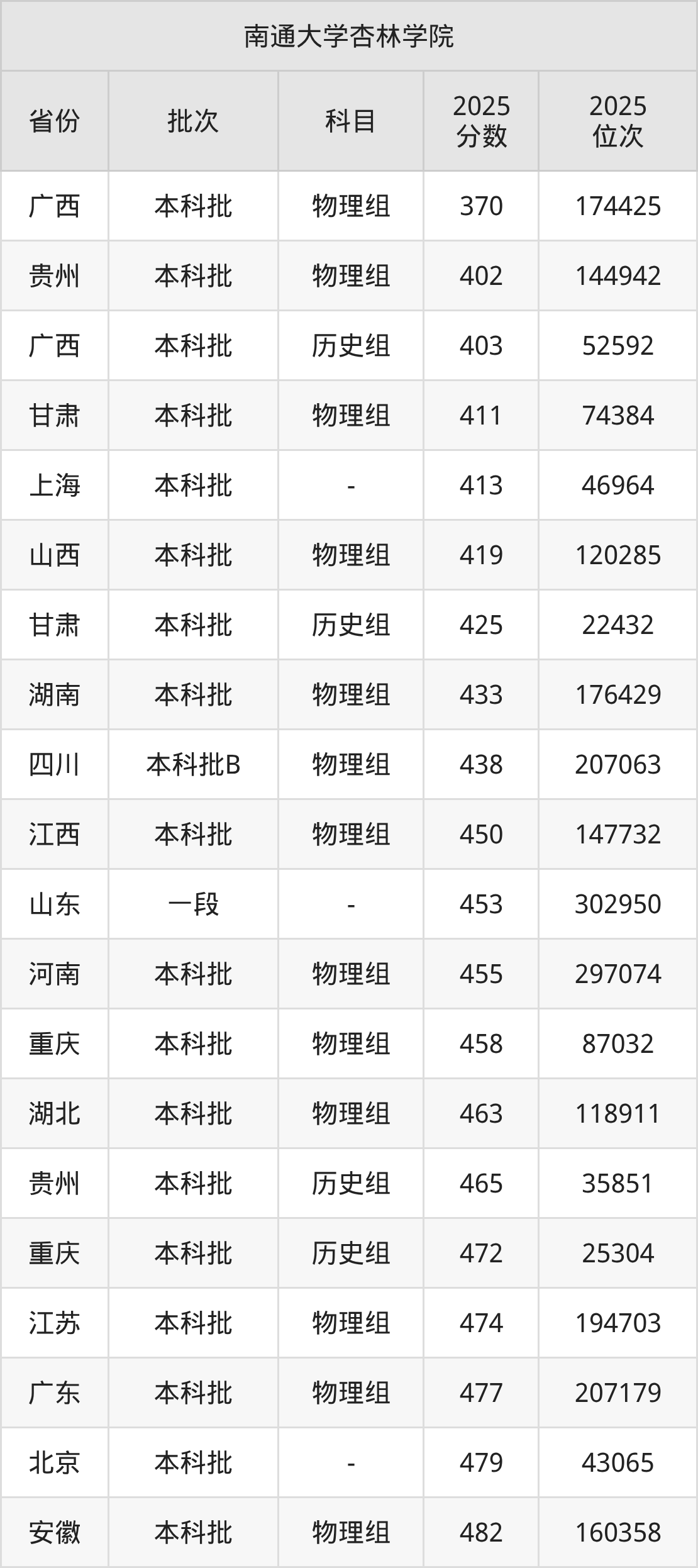 在广西本科批物理组,南通大学杏林学院的最低分是370、最低录取位次是174425名。在贵州本科批物理组,南通大学杏林学院的最低分是402、最低录取位次是144942名。