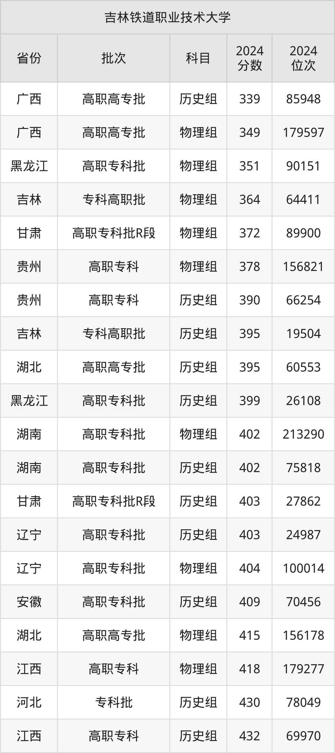 在广西高职高专批历史组,吉林铁道职业技术大学的最低分是339、最低录取位次是85948名。在黑龙江高职专科批物理组,吉林铁道职业技术大学的最低分是351、最低录取位次是90151名。
