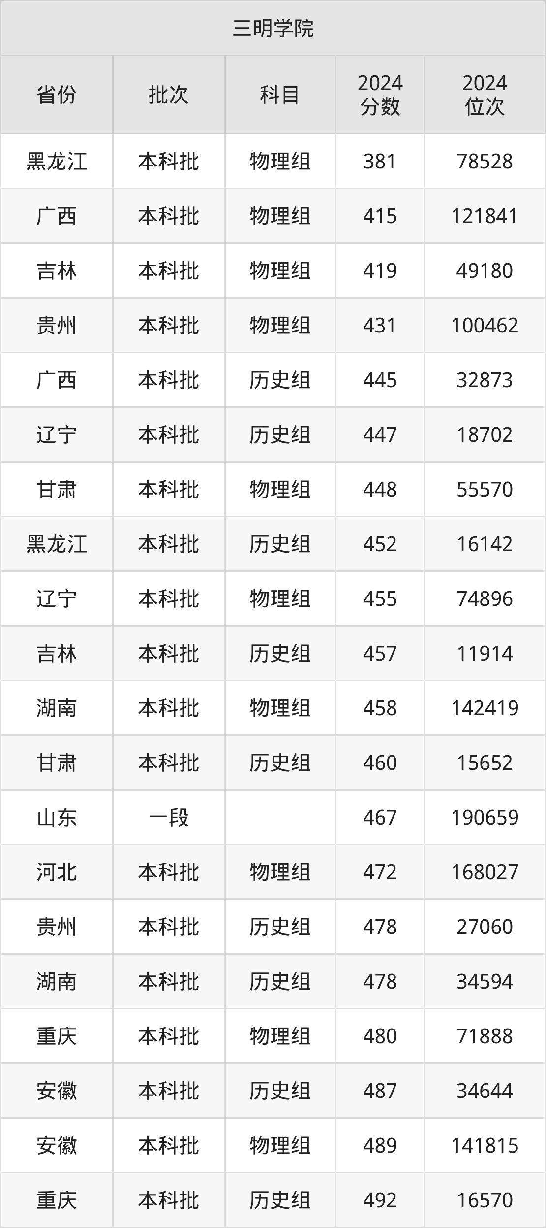 在黑龙江本科批物理组,三明学院的最低分是381、最低录取位次是78528名。在广西本科批物理组,三明学院的最低分是415、最低录取位次是121841名。