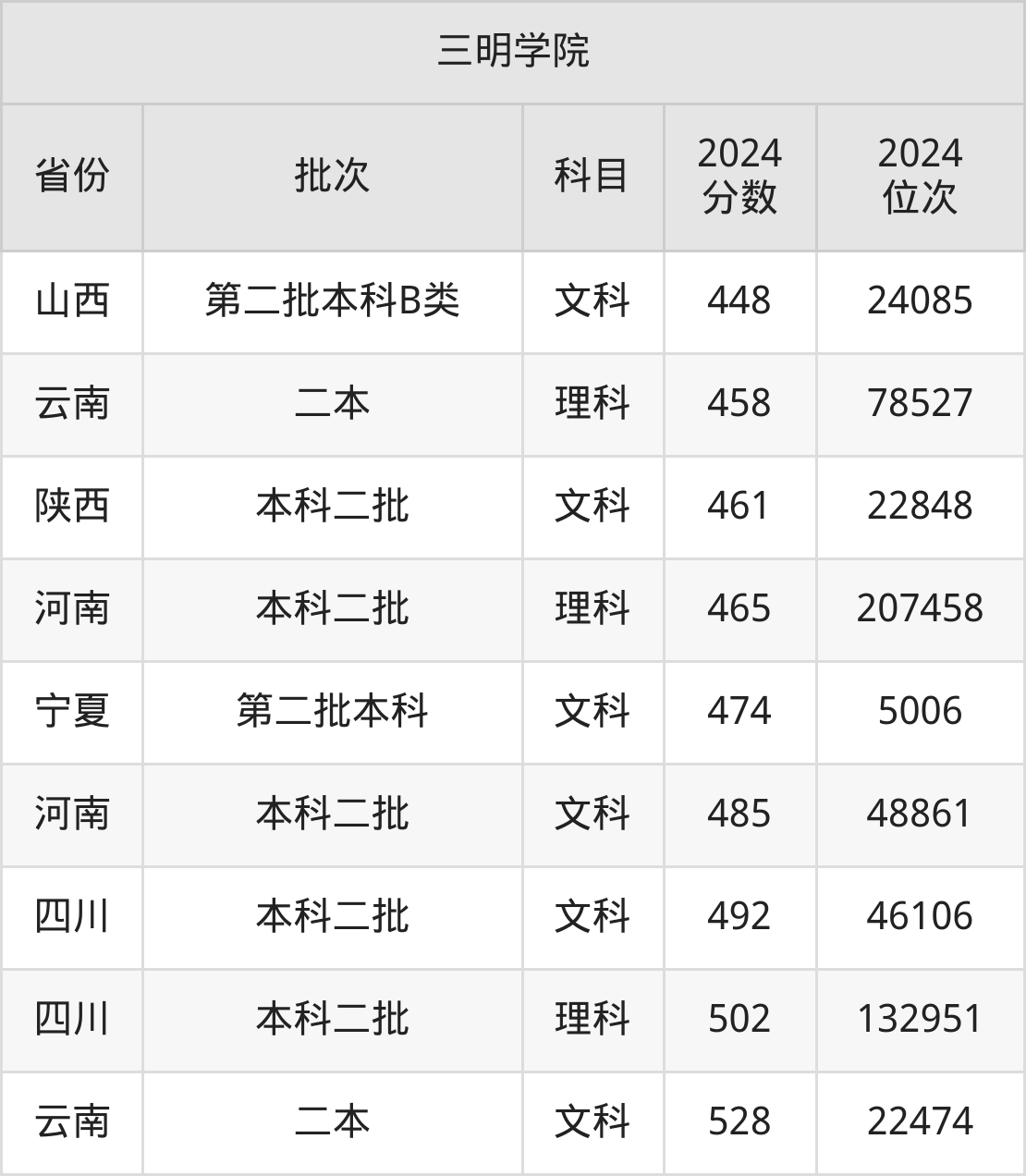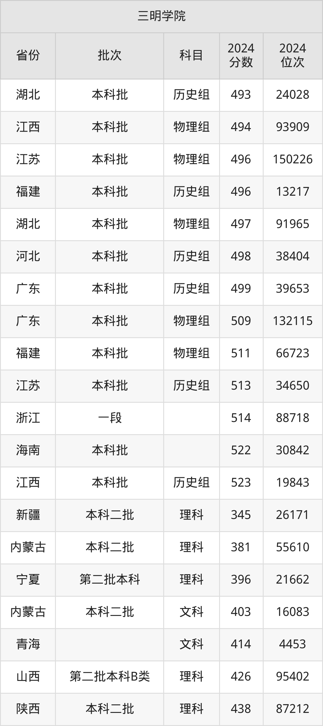 二、三明学院2024年录取分数线汇总