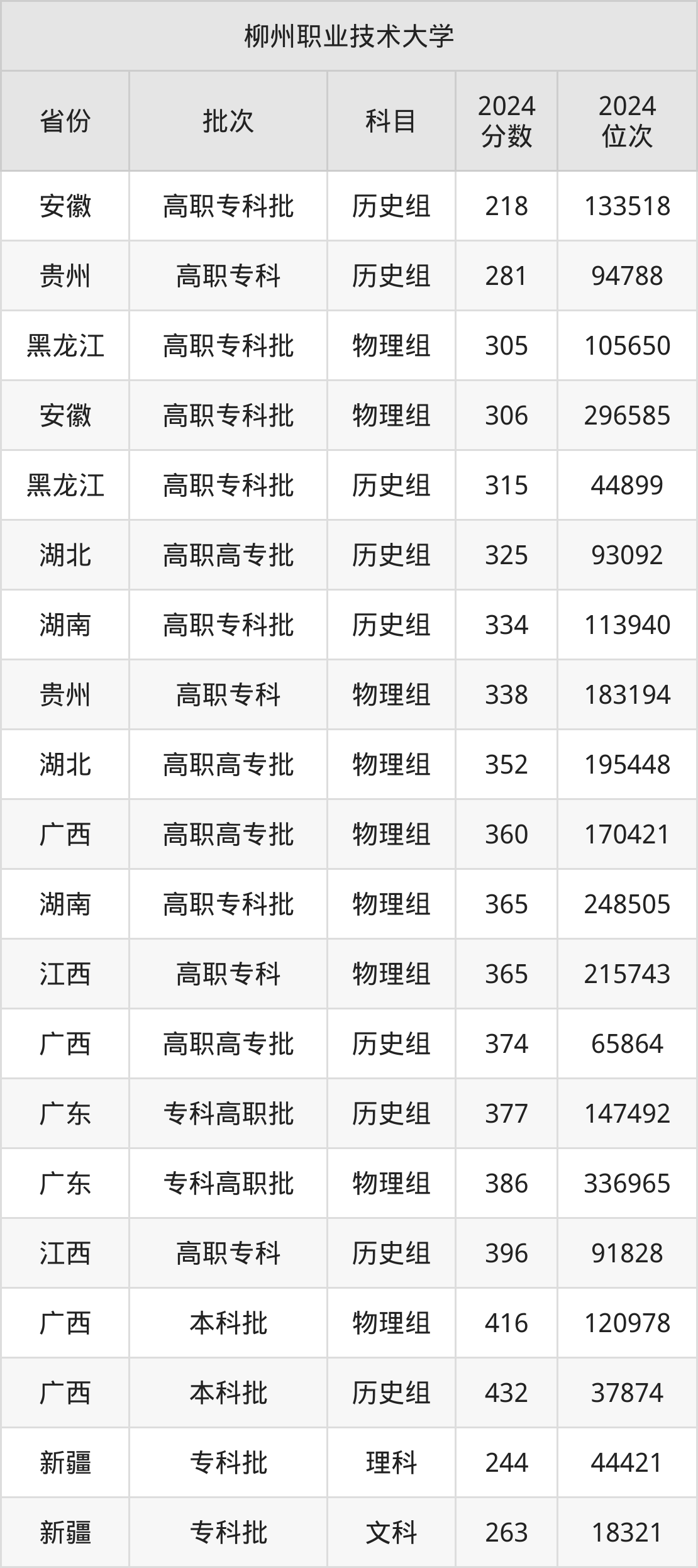在安徽高职专科批历史组,柳州职业技术大学的最低分是218、最低录取位次是133518名。在贵州高职专科历史组,柳州职业技术大学的最低分是281、最低录取位次是94788名。