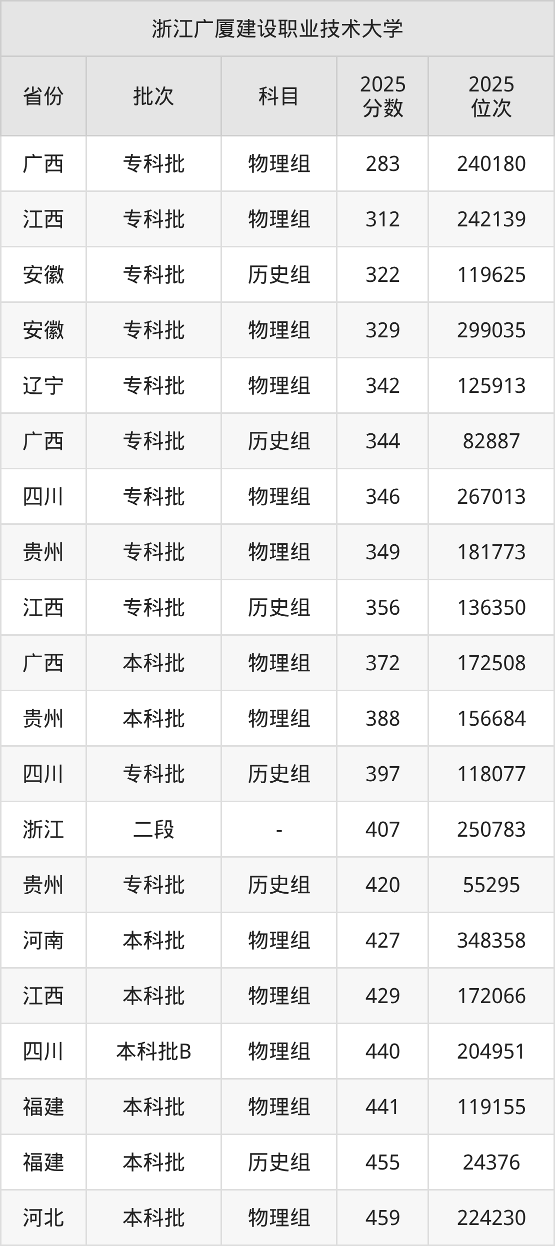 在广西专科批物理组,浙江广厦建设职业技术大学的最低分是283、最低录取位次是240180名。在江西专科批物理组,浙江广厦建设职业技术大学的最低分是312、最低录取位次是242139名。