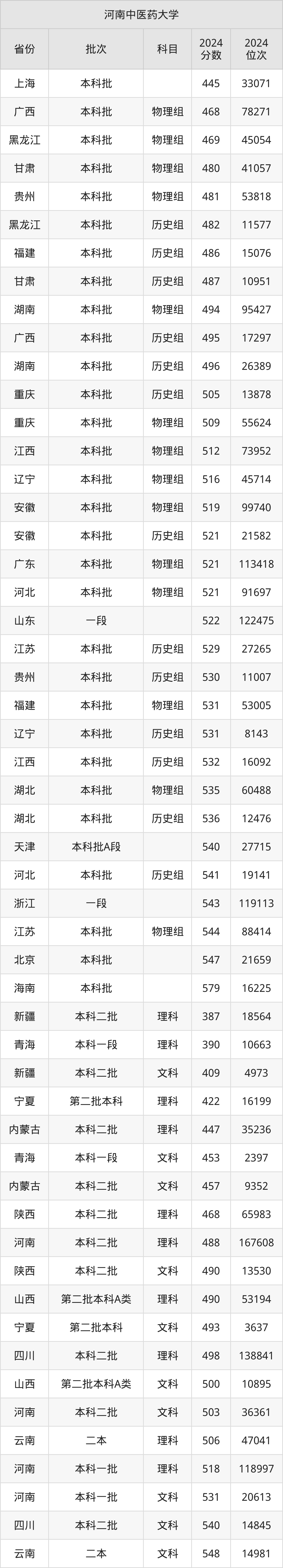 二、河南中医药大学2024年录取分数线汇总