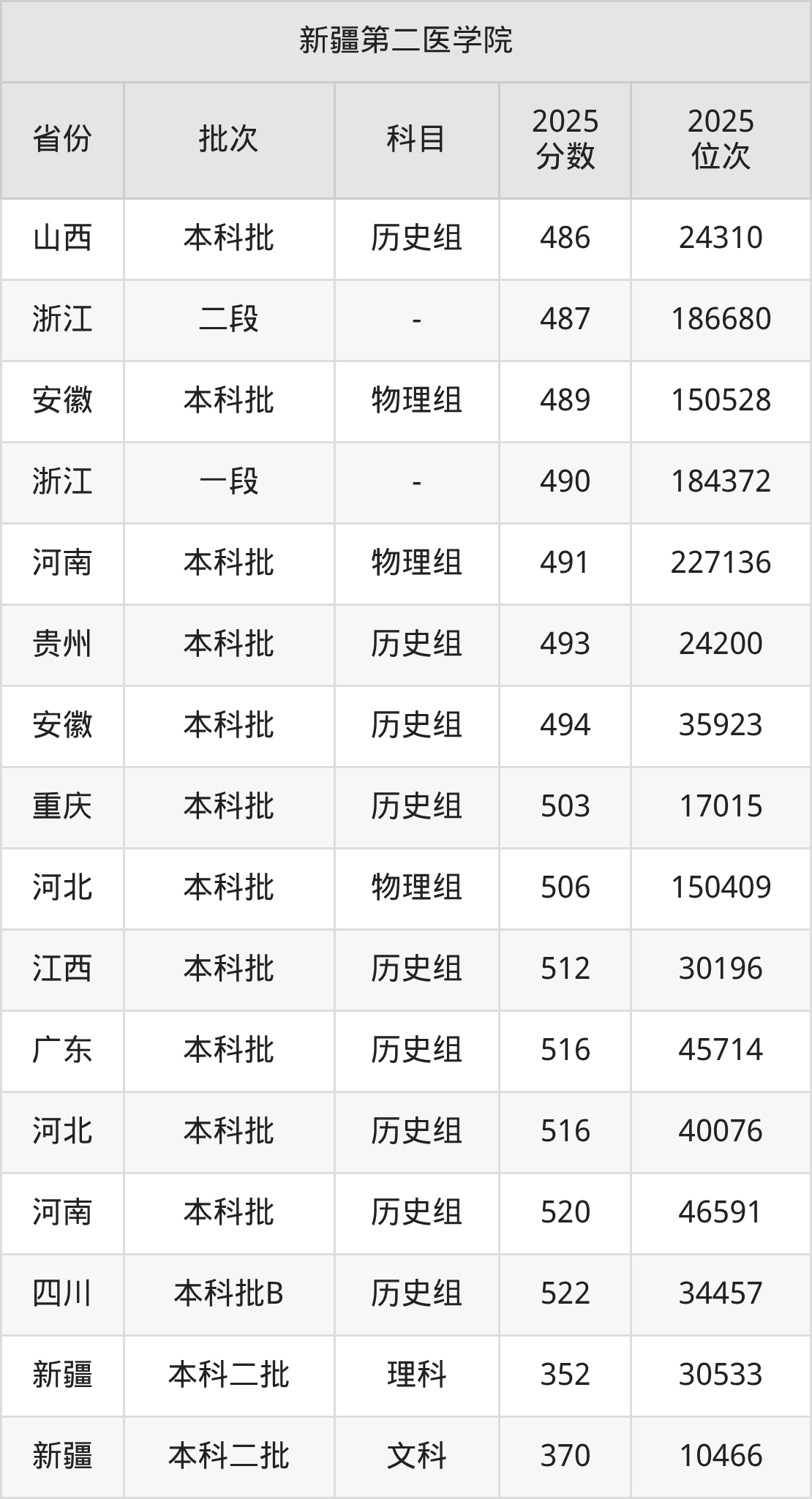 圆梦小编为2026届想要报考新疆第二医学院的同学整理了:新疆第二医学院2025年在全国22个省的最低分及录取位次。