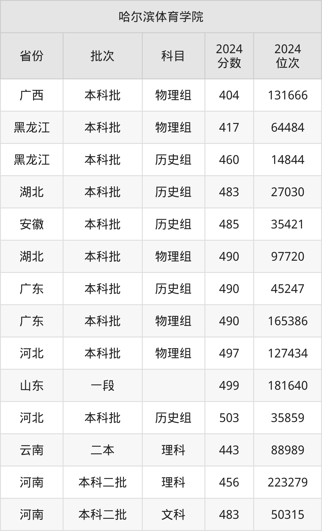 在广西本科批物理组,哈尔滨体育学院的最低分是404、最低录取位次是131666名。在黑龙江本科批物理组,哈尔滨体育学院的最低分是417、最低录取位次是64484名。