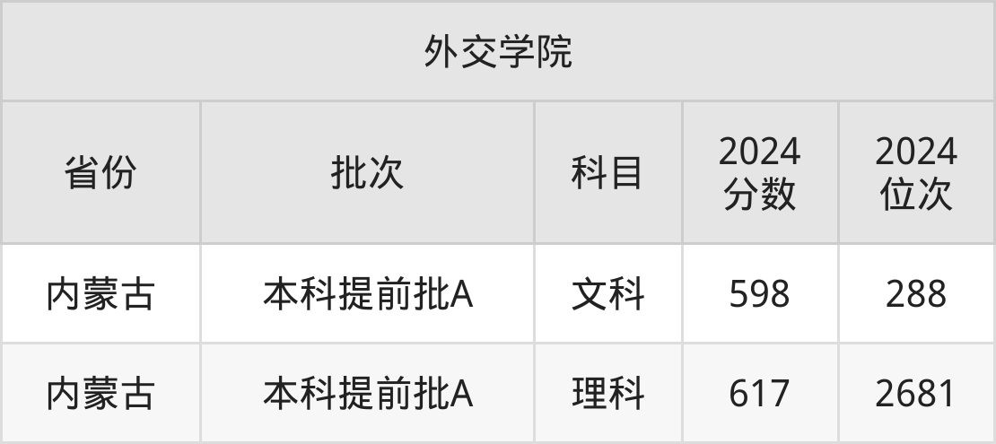 在内蒙古本科提前批A文科,外交学院的最低分是598、最低录取位次是288名。