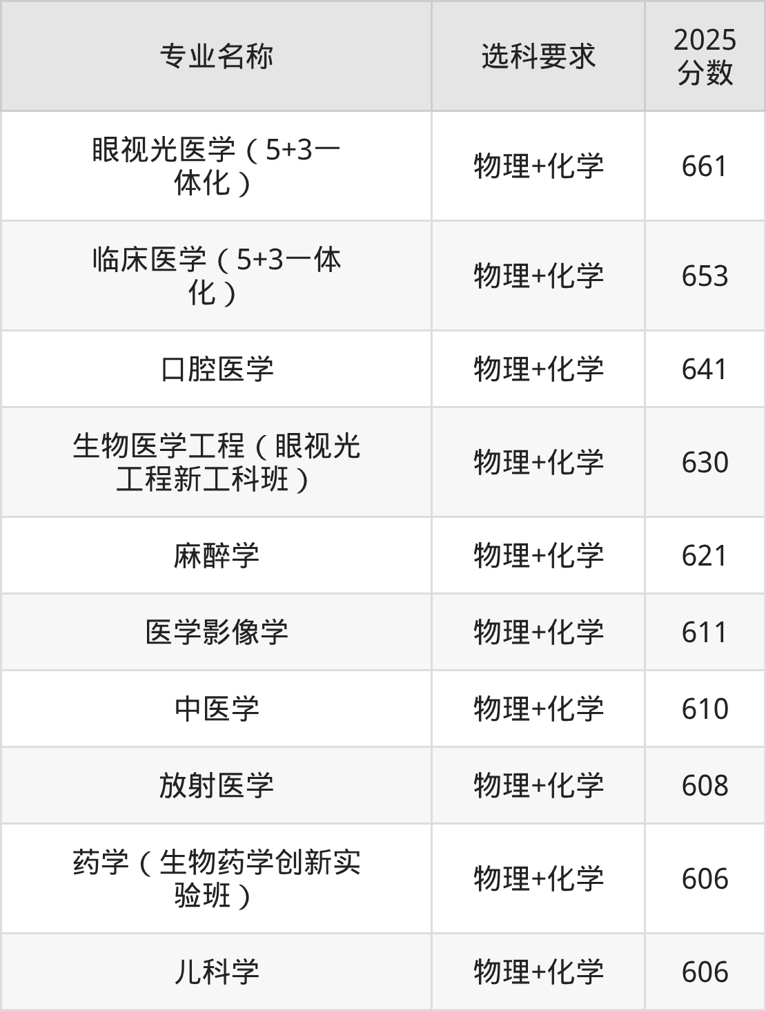| 眼视光医学(5+3一 体化) | 物理+化学 | 627 |