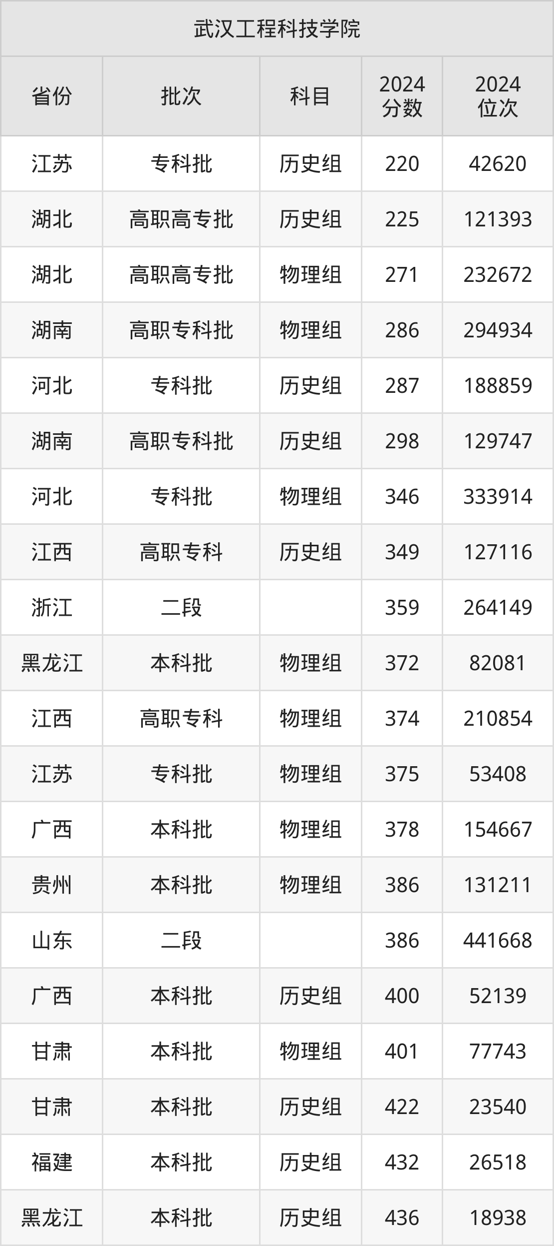 在江苏专科批历史组,武汉工程科技学院的最低分是220、最低录取位次是42620名。在湖北高职高专批历史组,武汉工程科技学院的最低分是225、最低录取位次是121393名。
