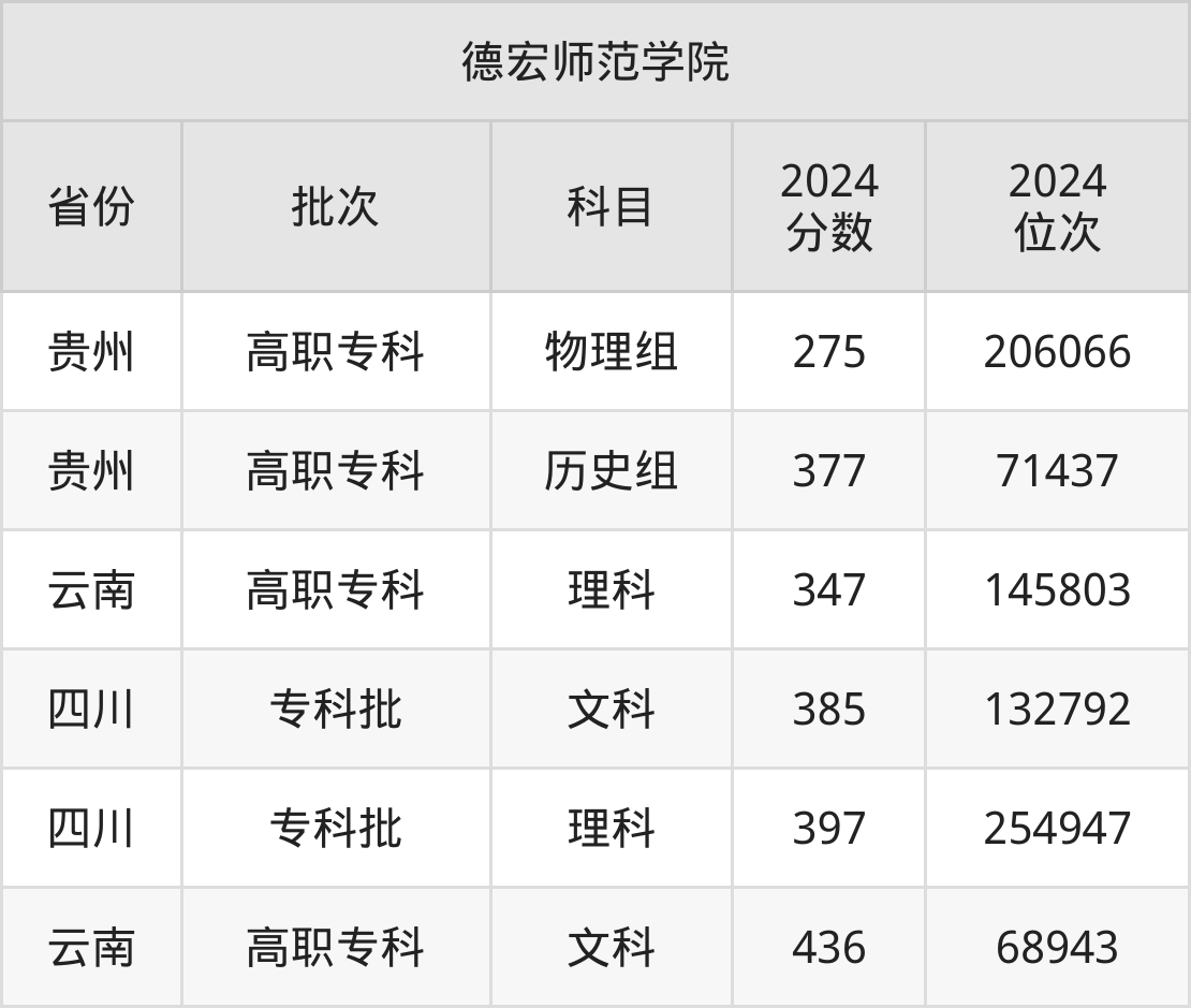 在贵州高职专科物理组,德宏师范学院的最低分是275、最低录取位次是206066名。在云南高职专科理科,德宏师范学院的最低分是347、最低录取位次是145803名。