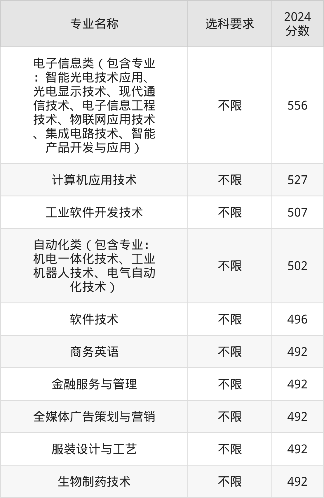 | 电子信息类(包含专业 :智能光电技术应用、 光电显示技术、现代通 信技术、电子信息工程 技术、物联网应用技术 、集成电路技术、智能 产品开发与应用) | 不限 | 465 |