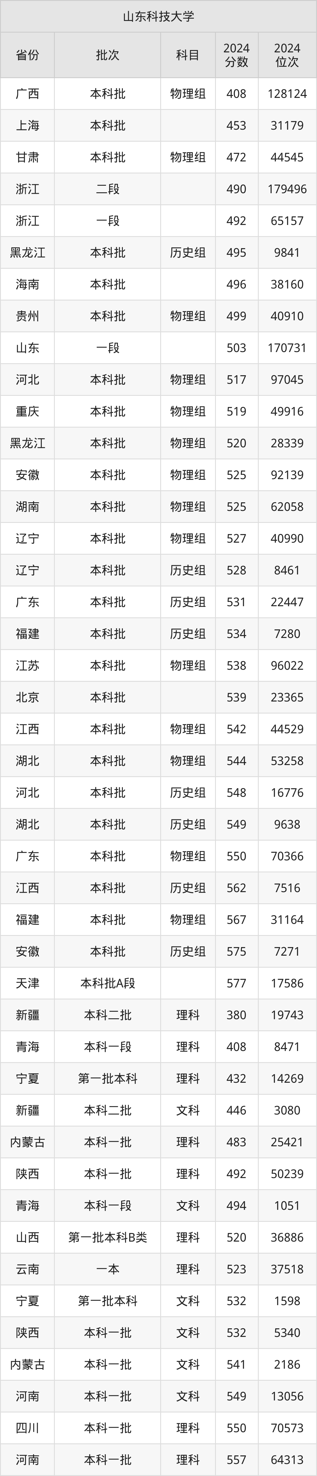 二、山东科技大学2024年录取分数线汇总