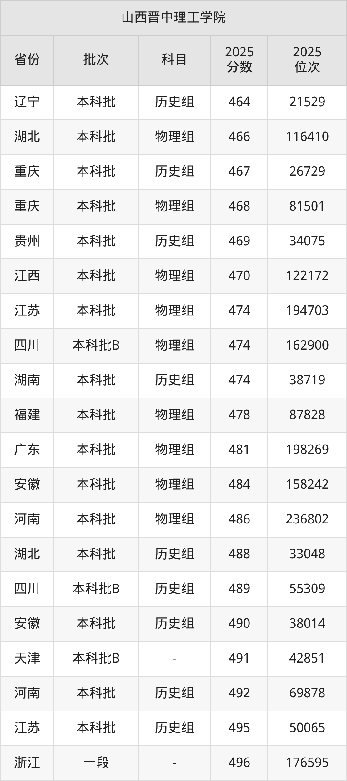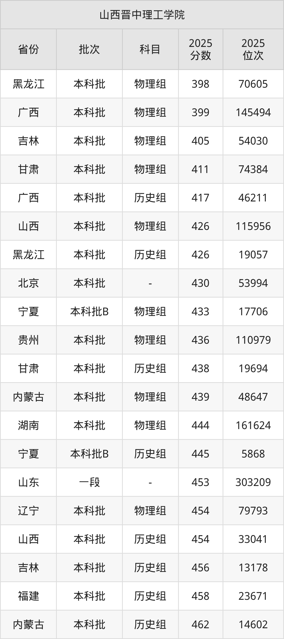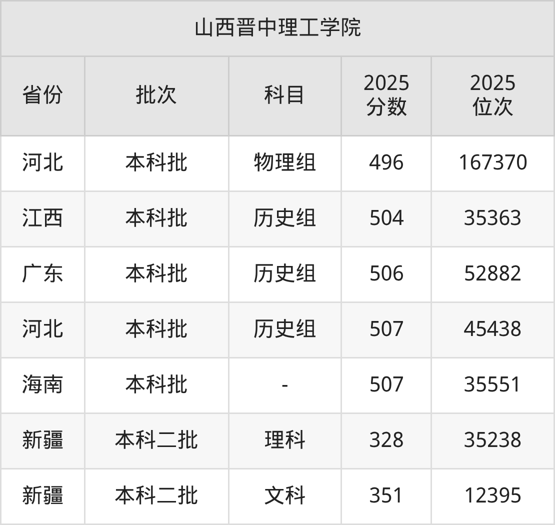 二、山西晋中理工学院2025年录取分数线汇总