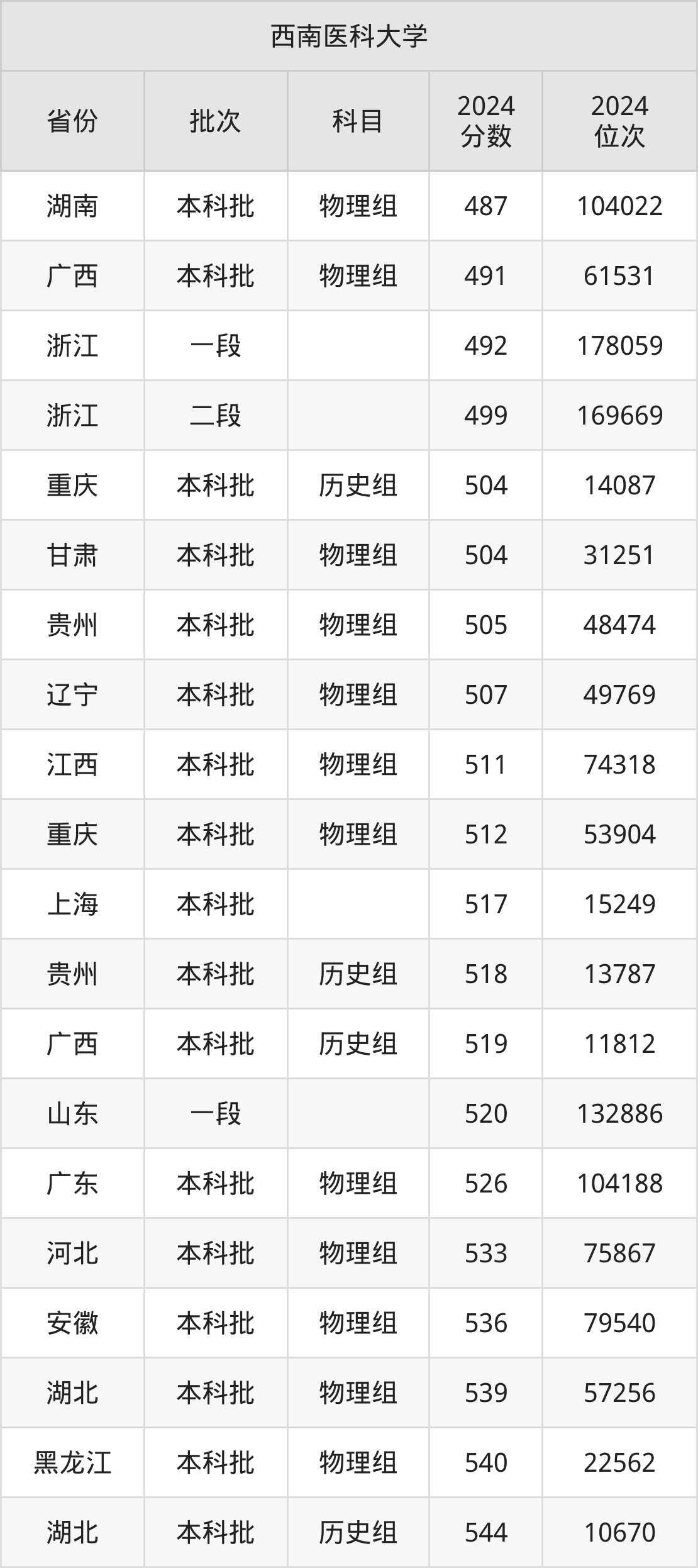 在湖南本科批物理组,西南医科大学的最低分是487、最低录取位次是104022名。在广西本科批物理组,西南医科大学的最低分是491、最低录取位次是61531名。