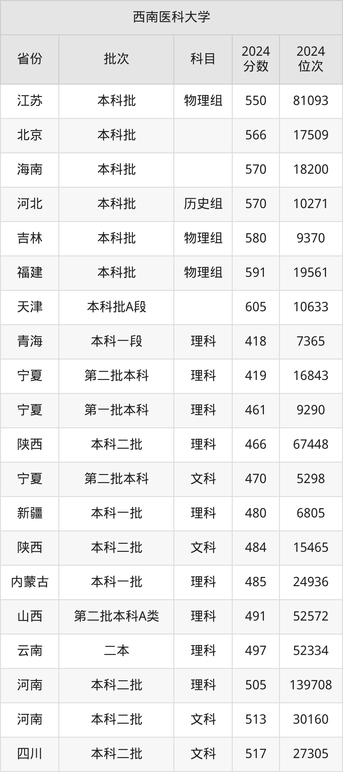 二、西南医科大学2024年录取分数线汇总
