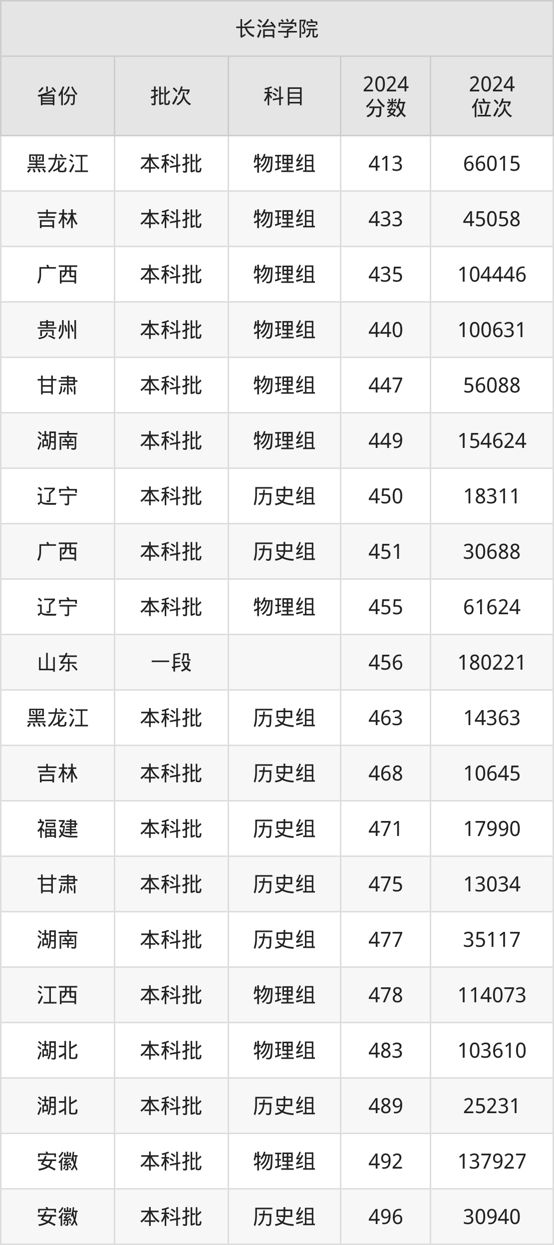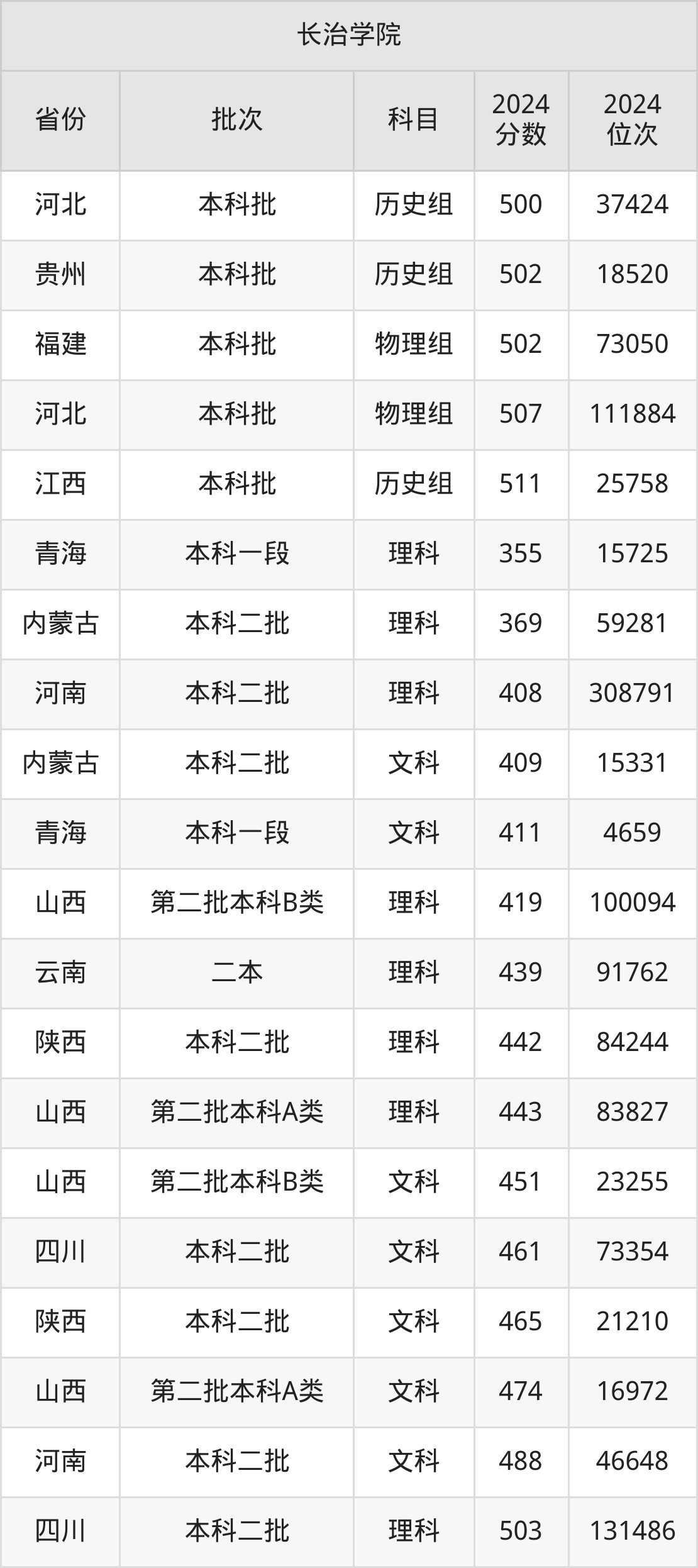 圆梦小编为2025届想要报考长治学院的同学整理了:长治学院2024年在全国20个省的最低分及录取位次。