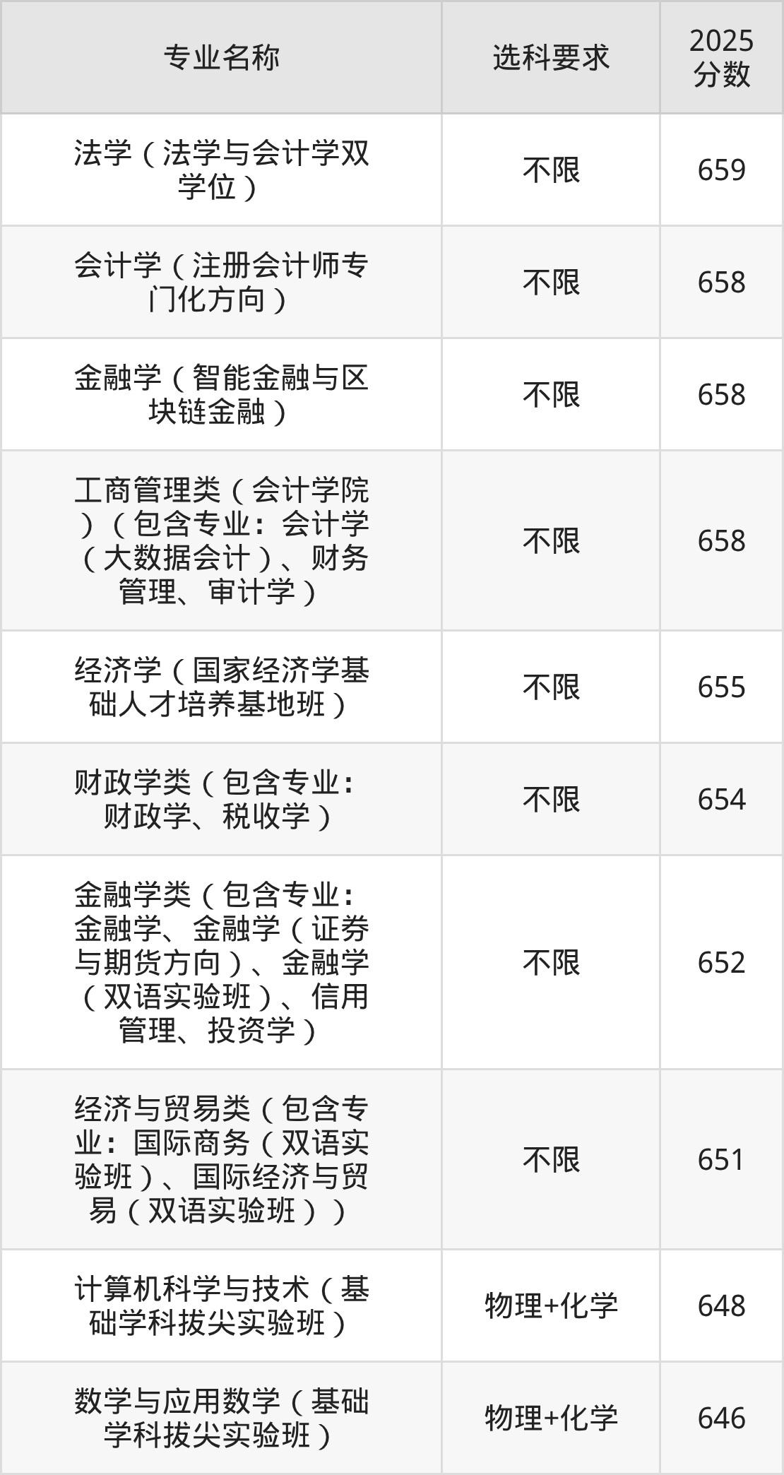 | 金融学类(包含专业: 金融学、金融学(证券 与期货方向)、金融学 (双语实验班)、信用 管理、投资学) | 不限 | 616 |