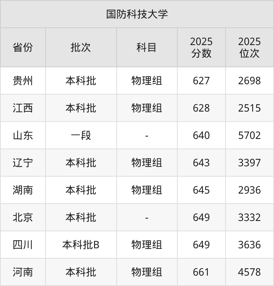在贵州本科批物理组,国防科技大学的最低分是627、最低录取位次是2698名。在江西本科批物理组,国防科技大学的最低分是628、最低录取位次是2515名。