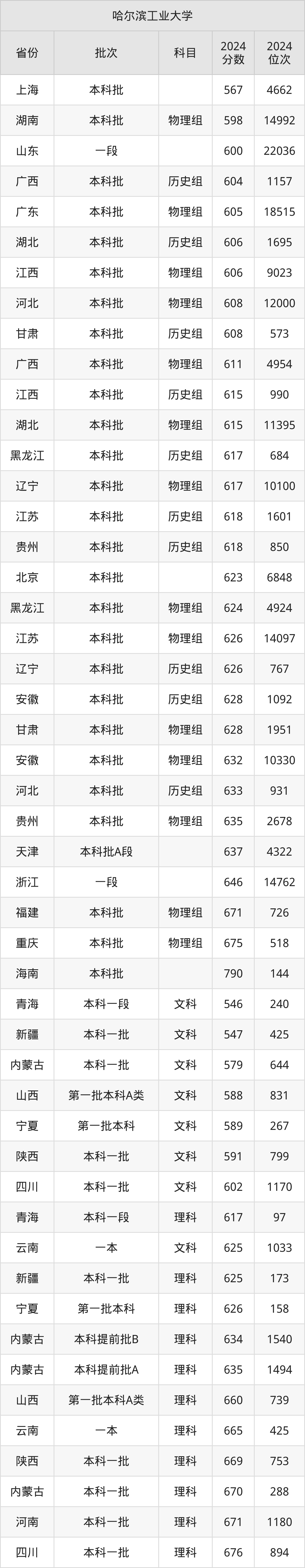 在上海本科批,哈尔滨工业大学的最低分是567、最低录取位次是4662名。在湖南本科批物理组,哈尔滨工业大学的最低分是598、最低录取位次是14992名。