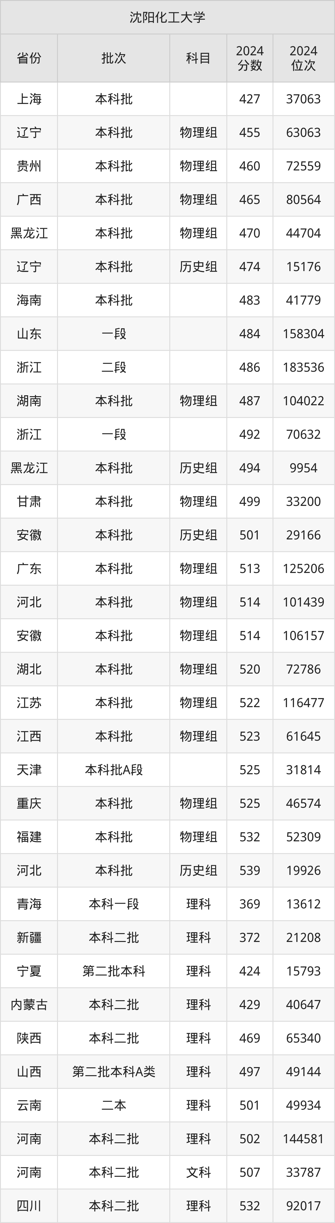 二、沈阳化工大学2024年录取分数线汇总