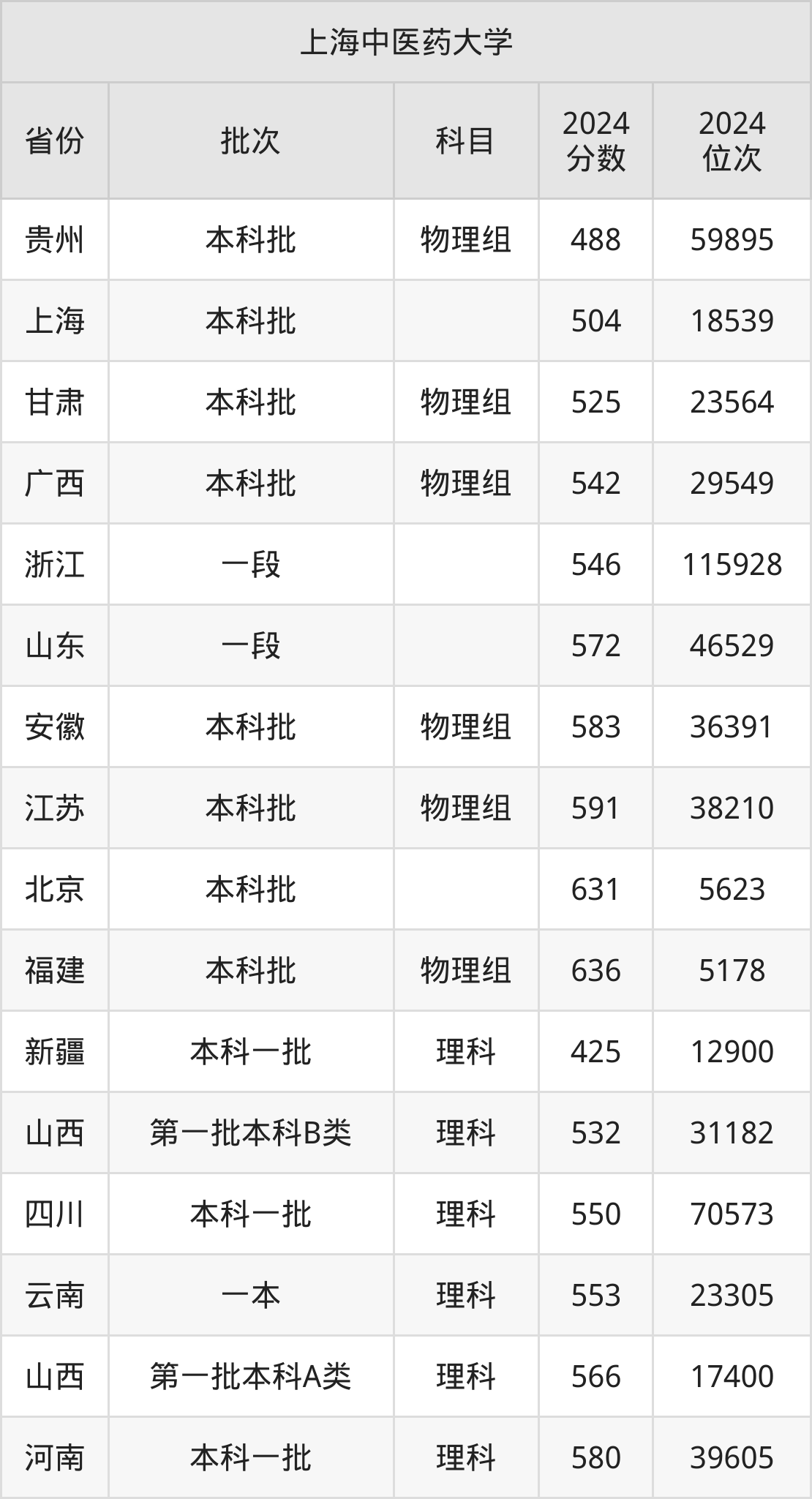 在贵州本科批物理组,上海中医药大学的最低分是488、最低录取位次是59895名。在上海本科批,上海中医药大学的最低分是504、最低录取位次是18539名。