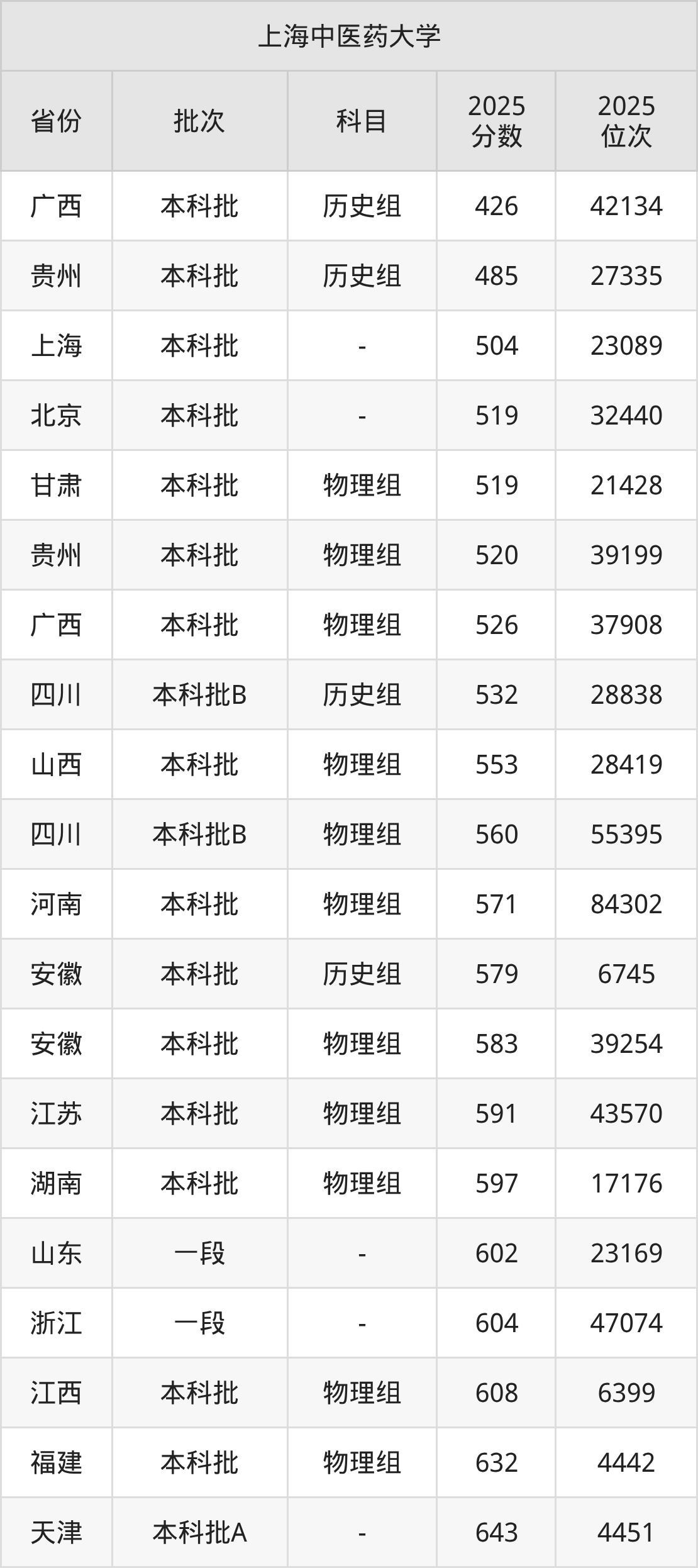 二、上海中医药大学2025年录取分数线汇总