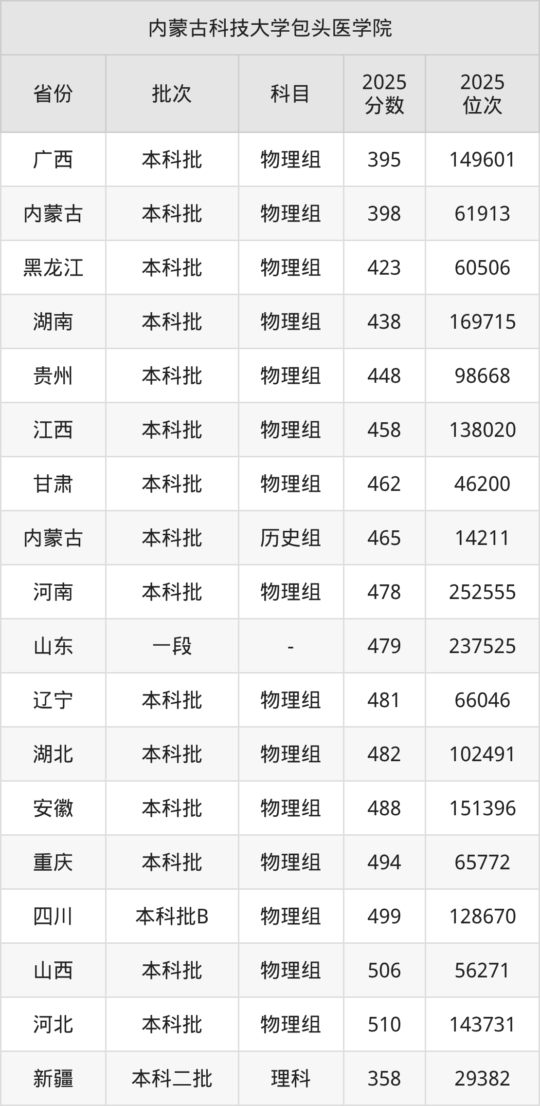 二、内蒙古科技大学包头医学院2025年录取分数线汇总
