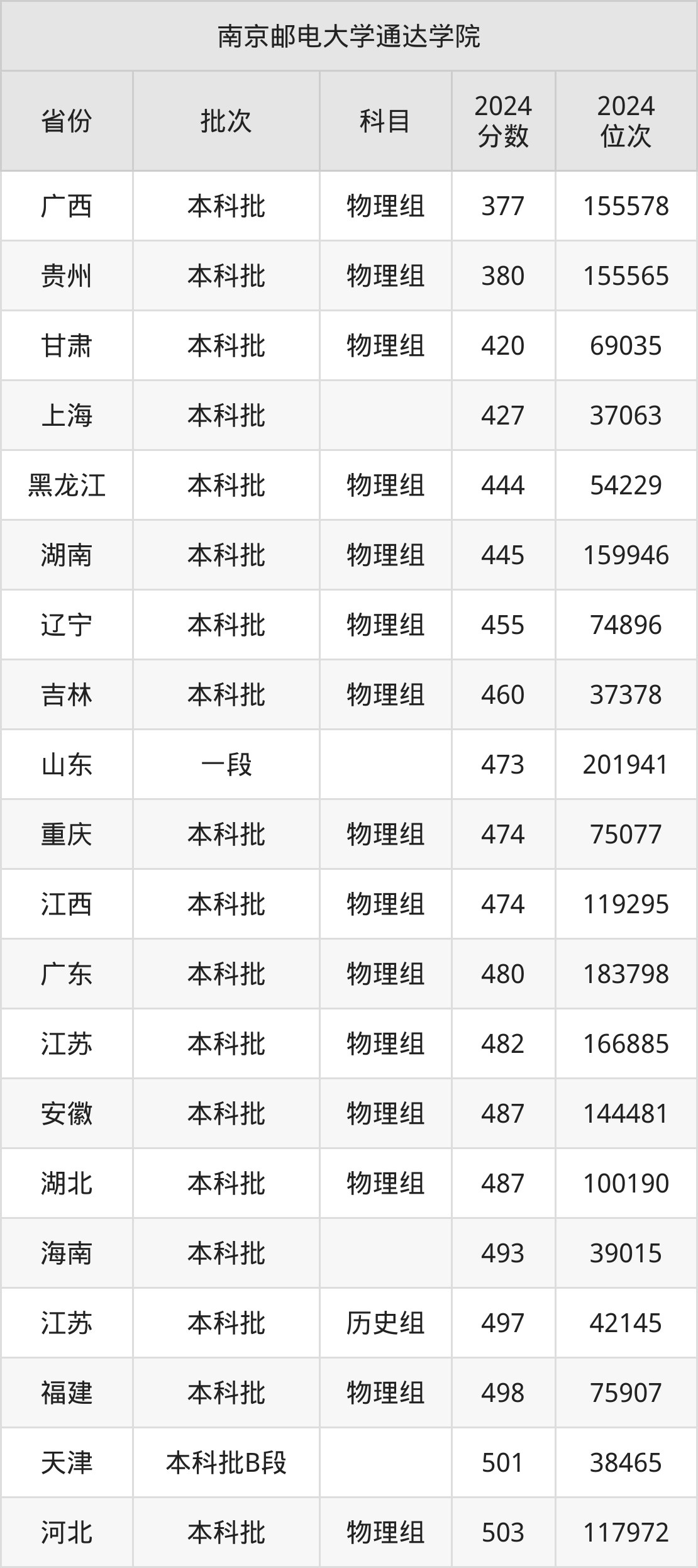 在广西本科批物理组,南京邮电大学通达学院的最低分是377、最低录取位次是155578名。在贵州本科批物理组,南京邮电大学通达学院的最低分是380、最低录取位次是155565名。