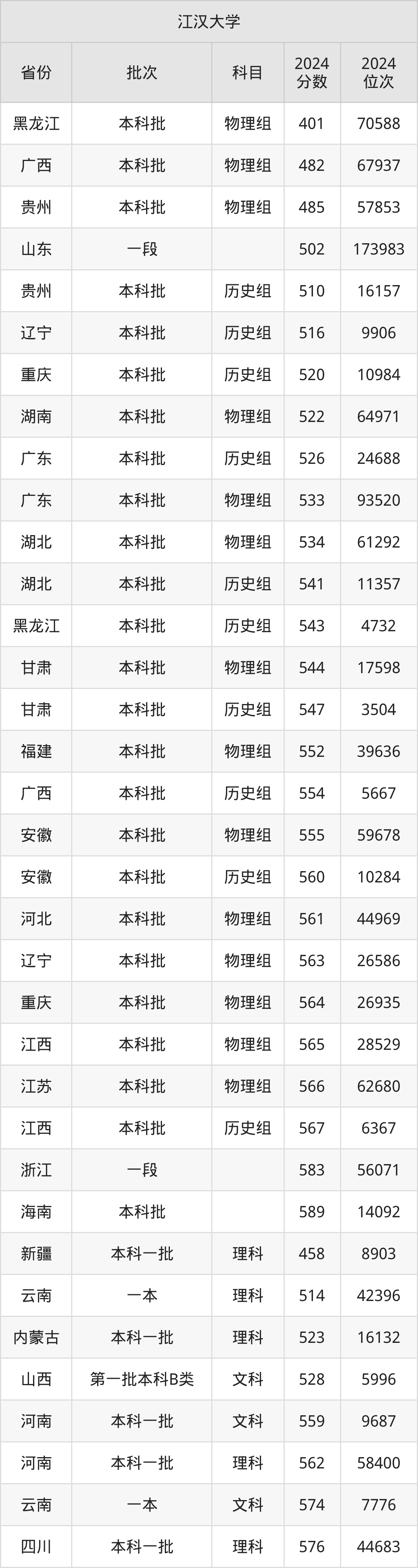 在黑龙江本科批物理组,江汉大学的最低分是401、最低录取位次是70588名。在广西本科批物理组,江汉大学的最低分是482、最低录取位次是67937名。