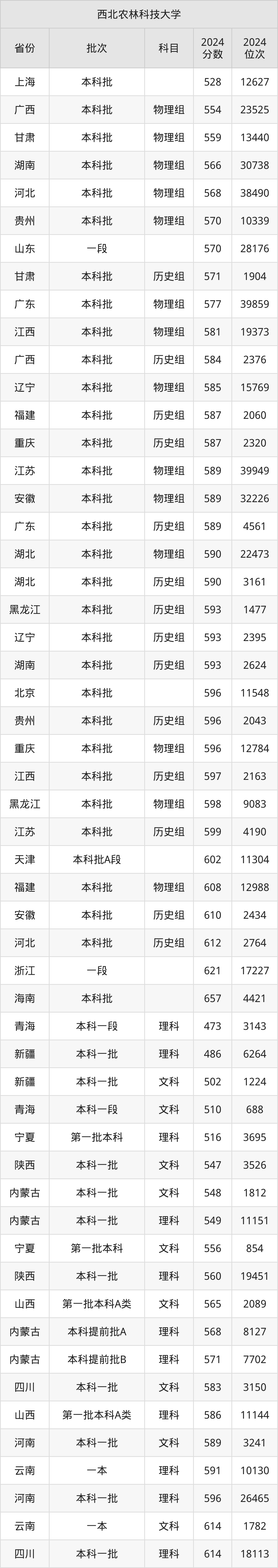 二、西北农林科技大学2024年录取分数线汇总