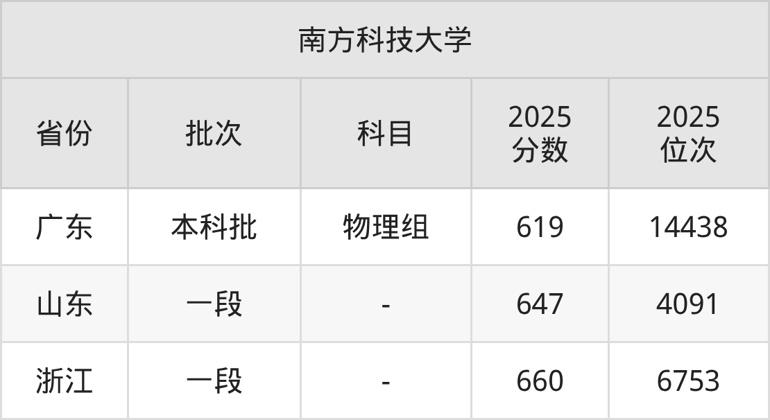 在广东本科批物理组,南方科技大学的最低分是619、最低录取位次是14438名。在山东一段,南方科技大学的最低分是647、最低录取位次是4091名。