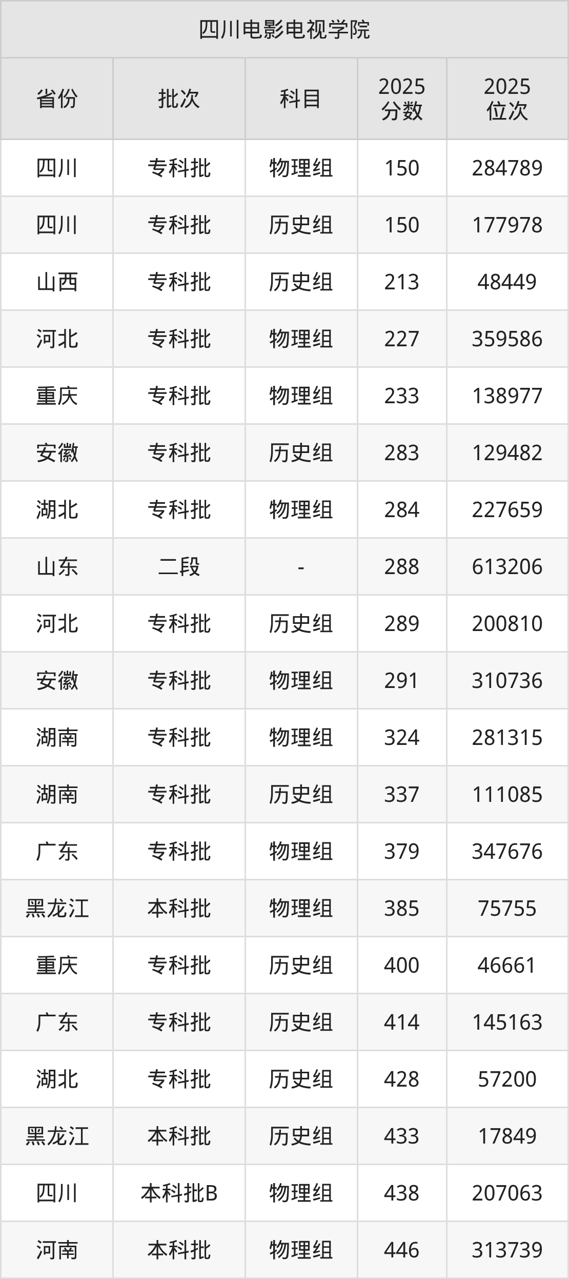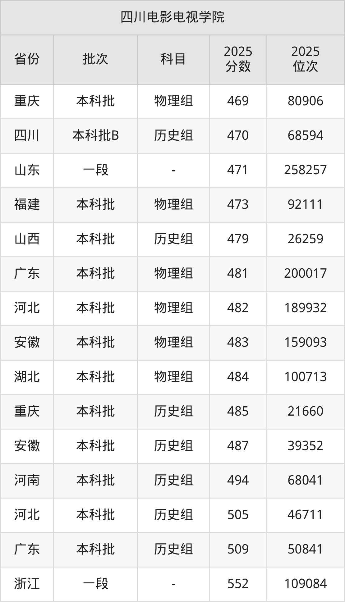 圆梦小编为2026届想要报考四川电影电视学院的同学整理了:四川电影电视学院2025年在全国13个省的最低分及录取位次。