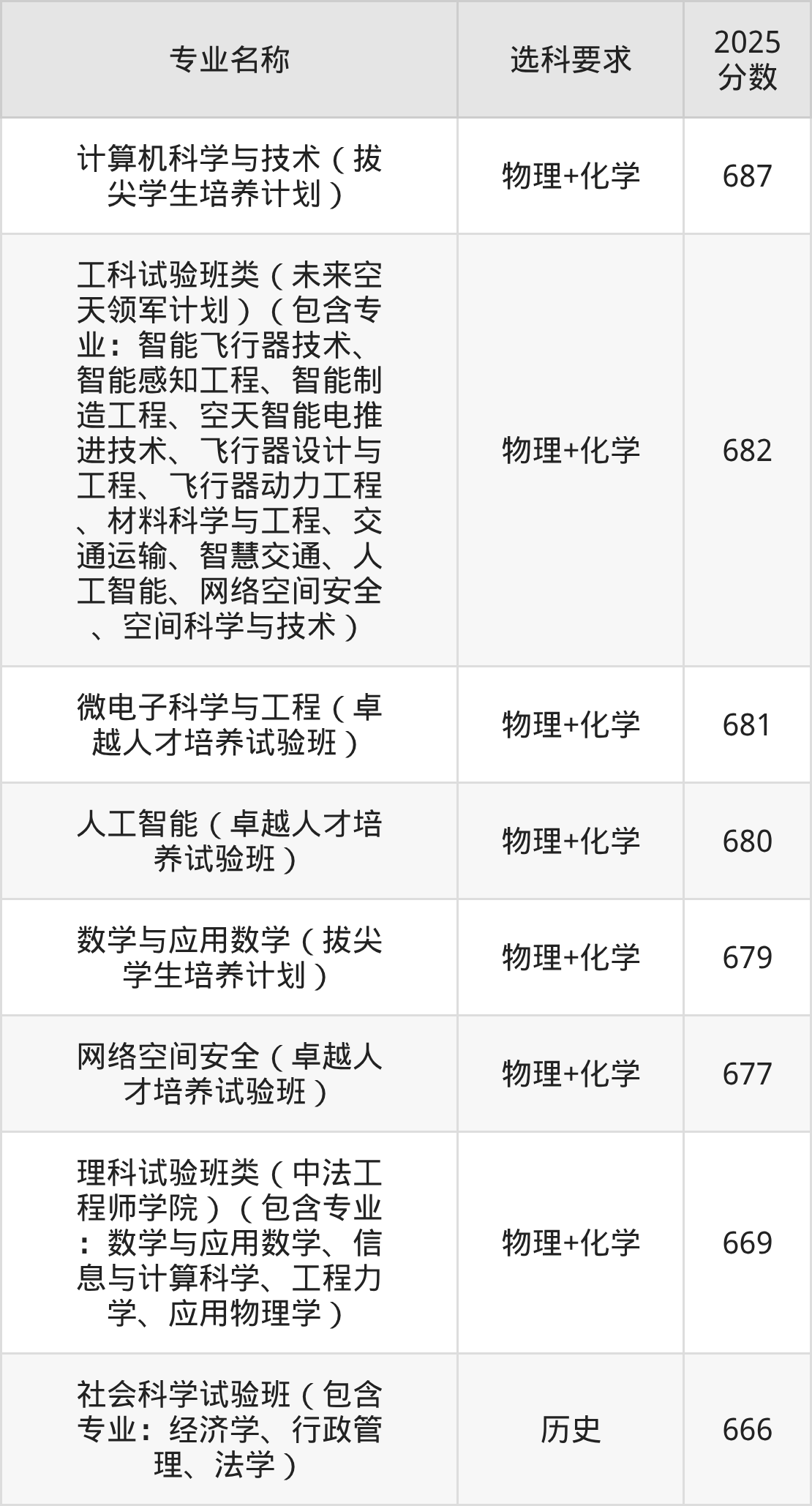 | 工科试验班类(未来空 天领军计划)(包含专 业:智能飞行器技术、 智能感知工程、智能制 造工程、空天智能电推 进技术、飞行器设计与 工程、飞行器动力工程 、材料科学与工程、交 通运输、智慧交通、人 工智能、网络空间安全 、空间科学与技术) | 物理+化学 | 676 |