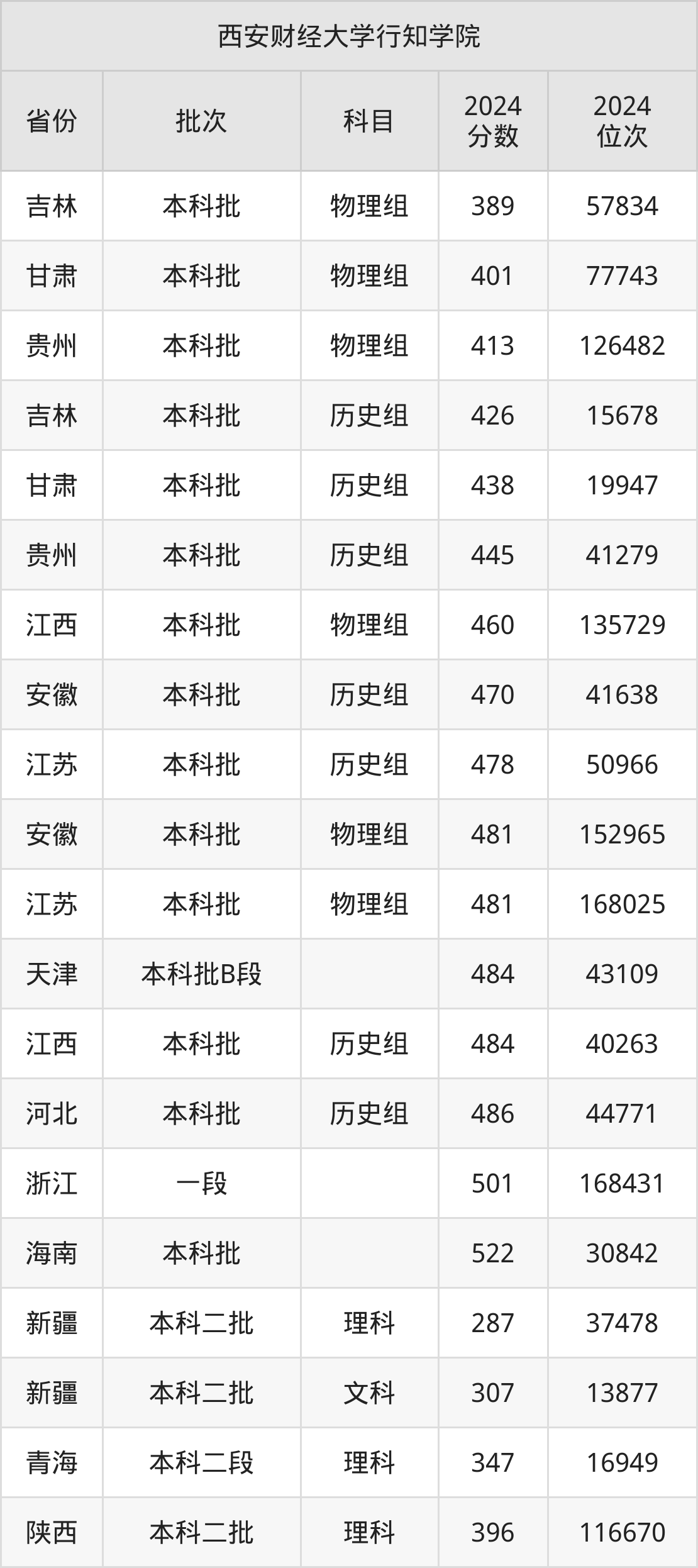 在吉林本科批物理组,西安财经大学行知学院的最低分是389、最低录取位次是57834名。在甘肃本科批物理组,西安财经大学行知学院的最低分是401、最低录取位次是77743名。