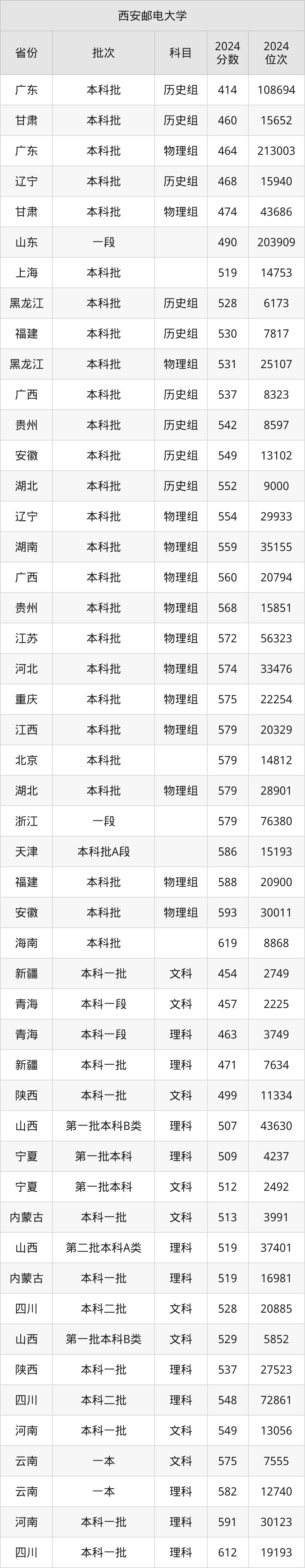 在广东本科批历史组,西安邮电大学的最低分是414、最低录取位次是108694名。在甘肃本科批历史组,西安邮电大学的最低分是460、最低录取位次是15652名。
