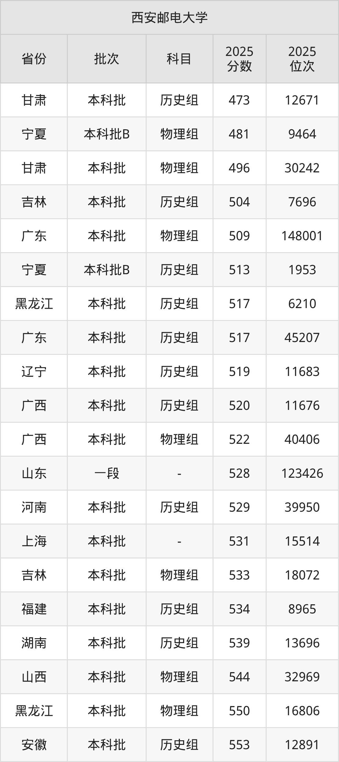 在甘肃本科批历史组,西安邮电大学的最低分是473、最低录取位次是12671名。在宁夏本科批B物理组,西安邮电大学的最低分是481、最低录取位次是9464名。