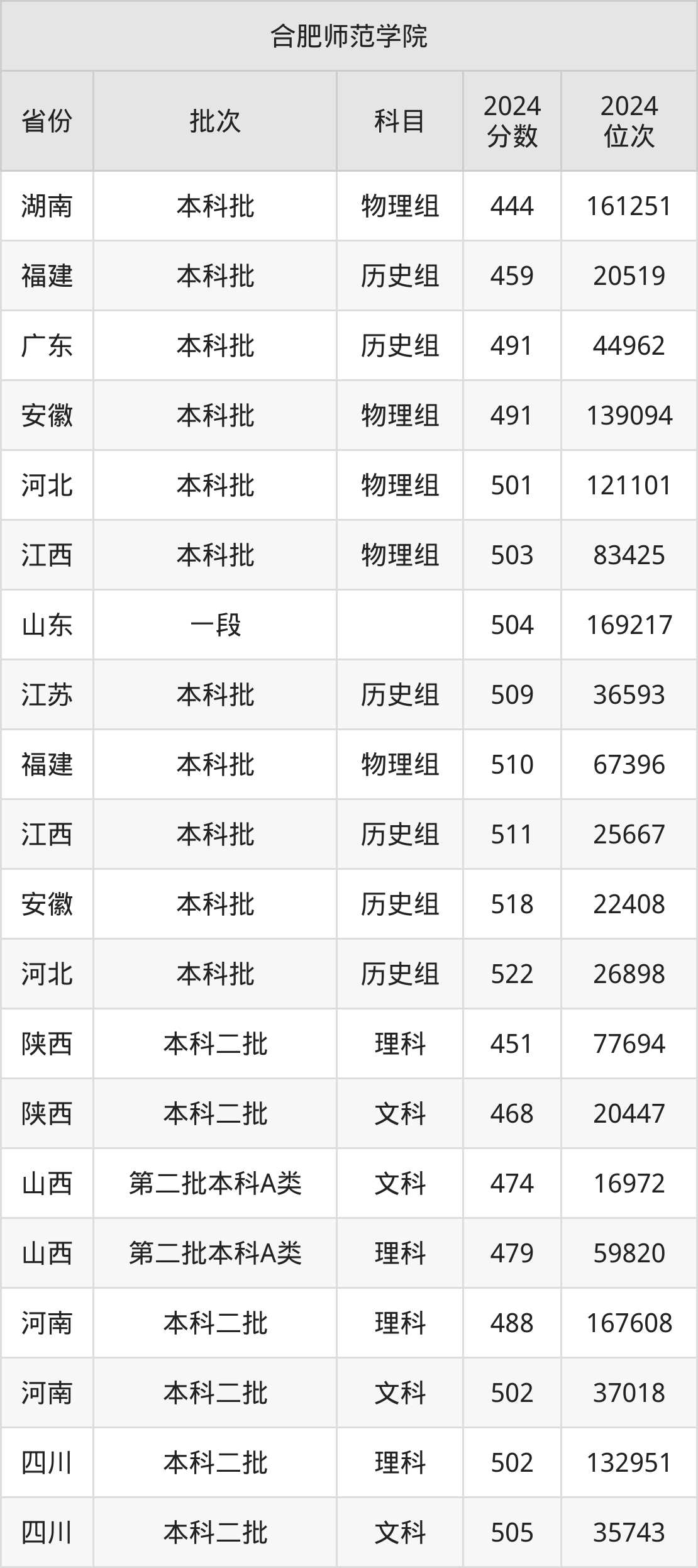在湖南本科批物理组,合肥师范学院的最低分是444、最低录取位次是161251名。在福建本科批历史组,合肥师范学院的最低分是459、最低录取位次是20519名。