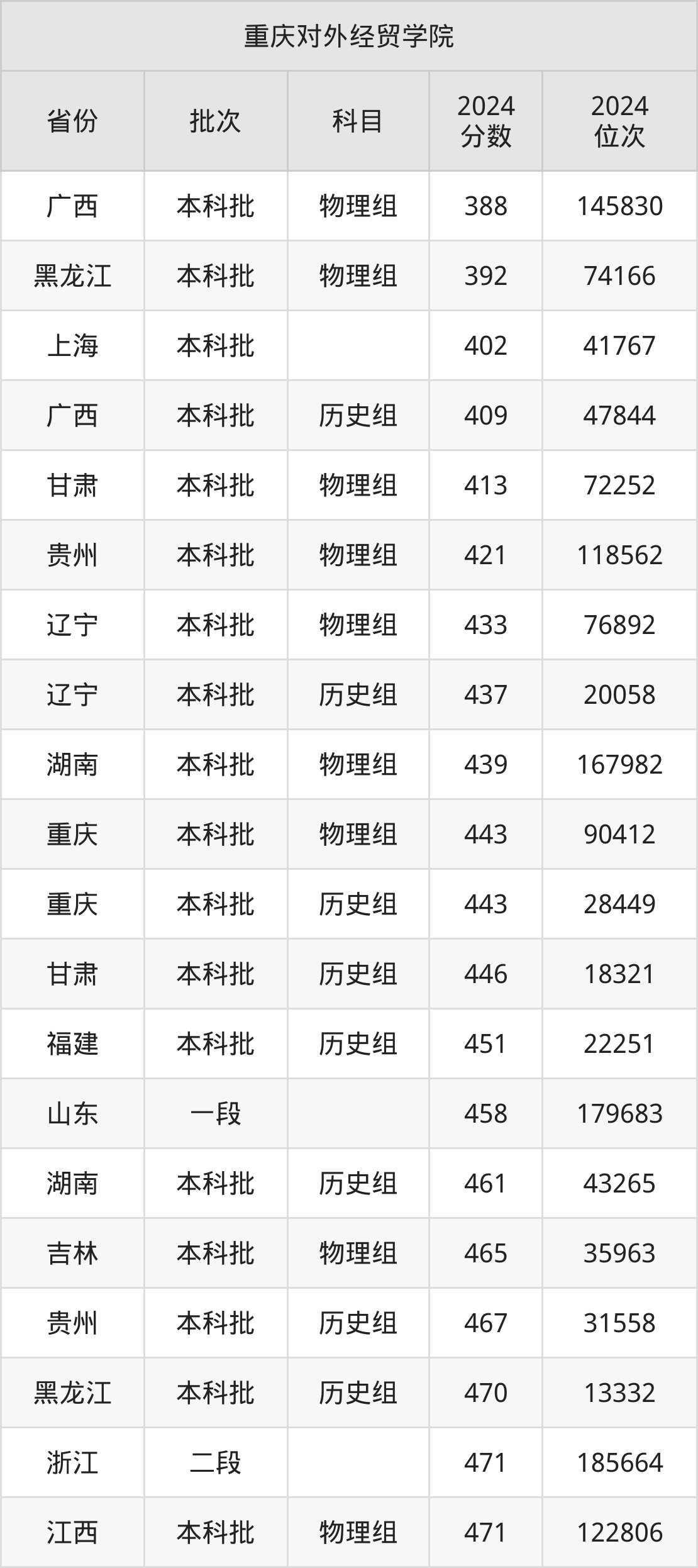 在广西本科批物理组,重庆对外经贸学院的最低分是388、最低录取位次是145830名。在黑龙江本科批物理组,重庆对外经贸学院的最低分是392、最低录取位次是74166名。