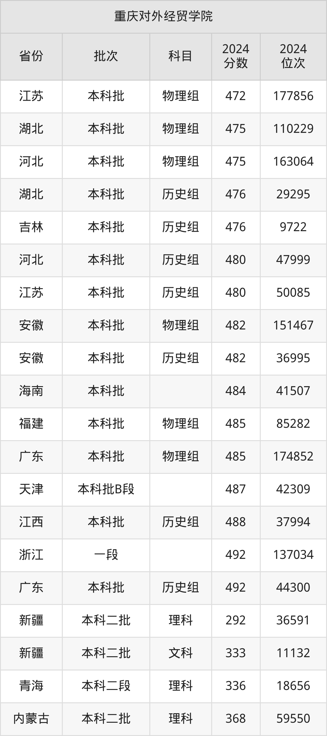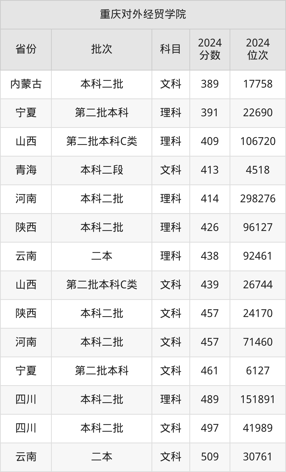 圆梦小编为2025届想要报考重庆对外经贸学院的同学整理了:重庆对外经贸学院2024年在全国29个省的最低分及录取位次。
