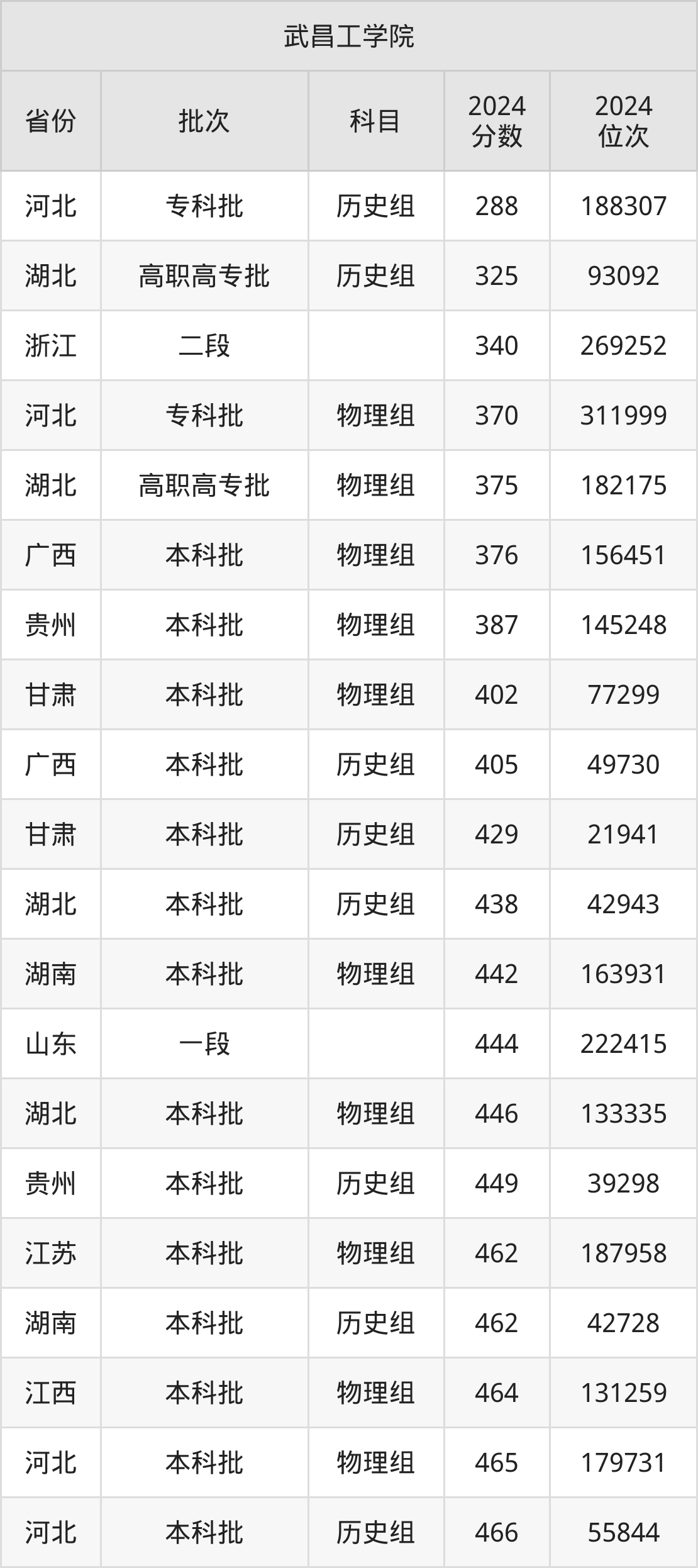 在河北专科批历史组,武昌工学院的最低分是288、最低录取位次是188307名。在湖北高职高专批历史组,武昌工学院的最低分是325、最低录取位次是93092名。