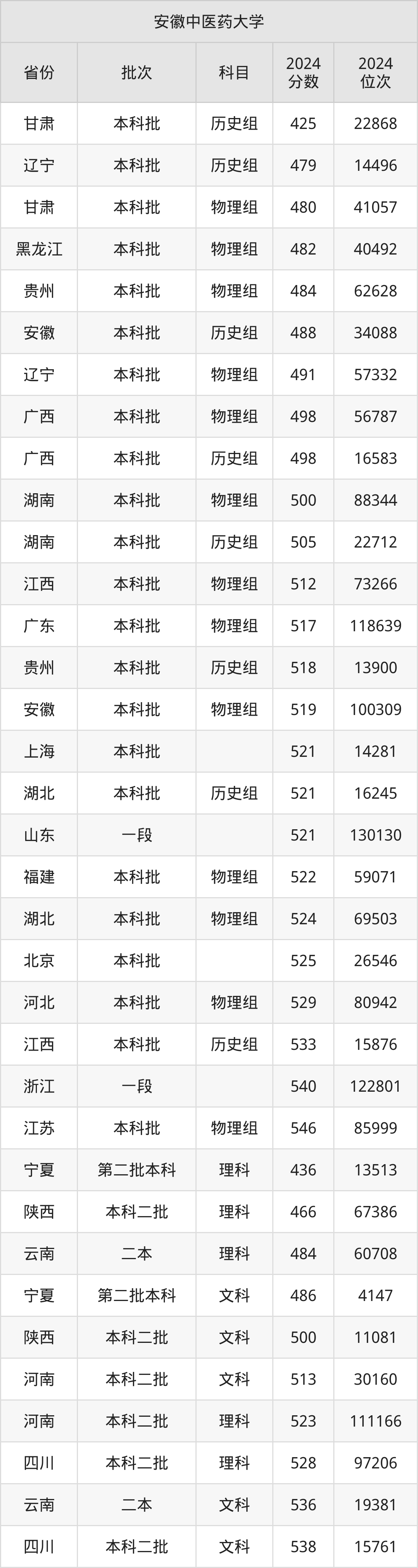 二、安徽中医药大学2024年录取分数线汇总
