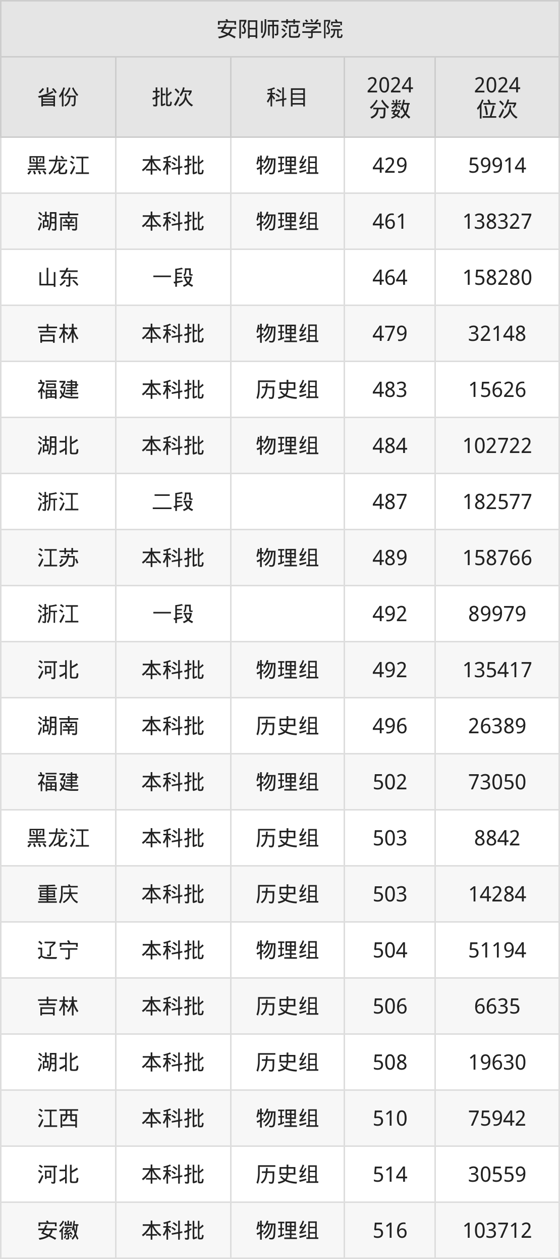 在黑龙江本科批物理组,安阳师范学院的最低分是429、最低录取位次是59914名。在湖南本科批物理组,安阳师范学院的最低分是461、最低录取位次是138327名。