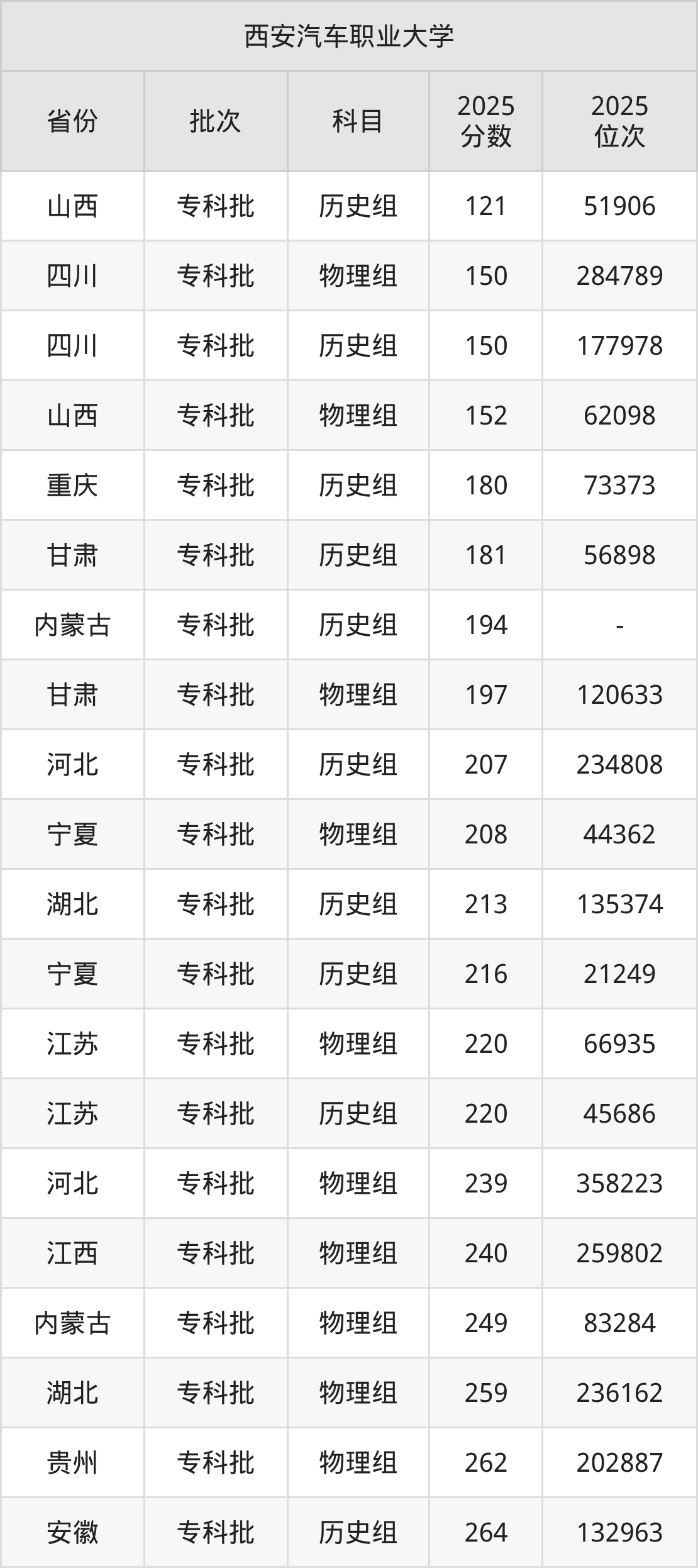 在山西专科批历史组,西安汽车职业大学的最低分是121、最低录取位次是51906名。在四川专科批物理组,西安汽车职业大学的最低分是150、最低录取位次是284789名。
