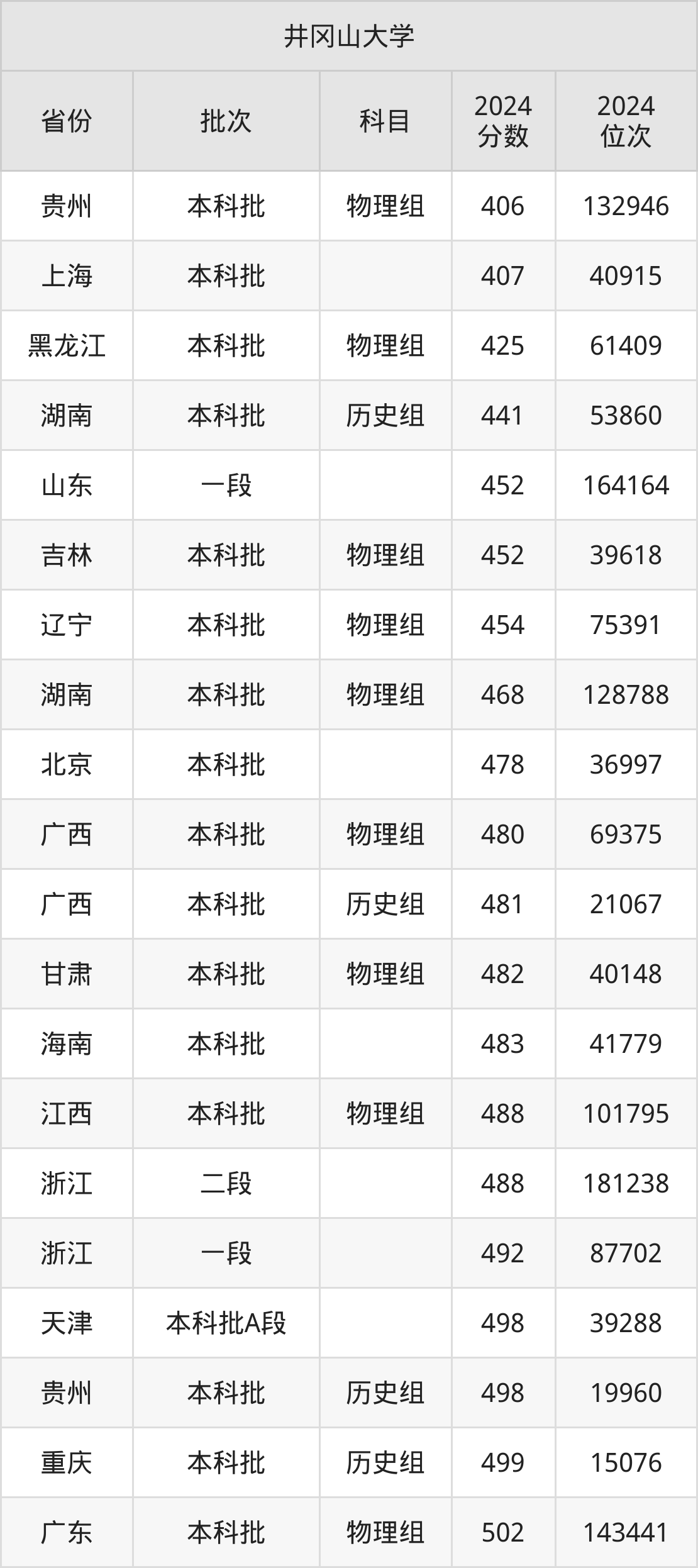 在贵州本科批物理组,井冈山大学的最低分是406、最低录取位次是132946名。在上海本科批,井冈山大学的最低分是407、最低录取位次是40915名。