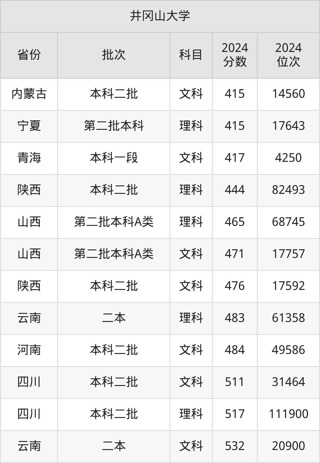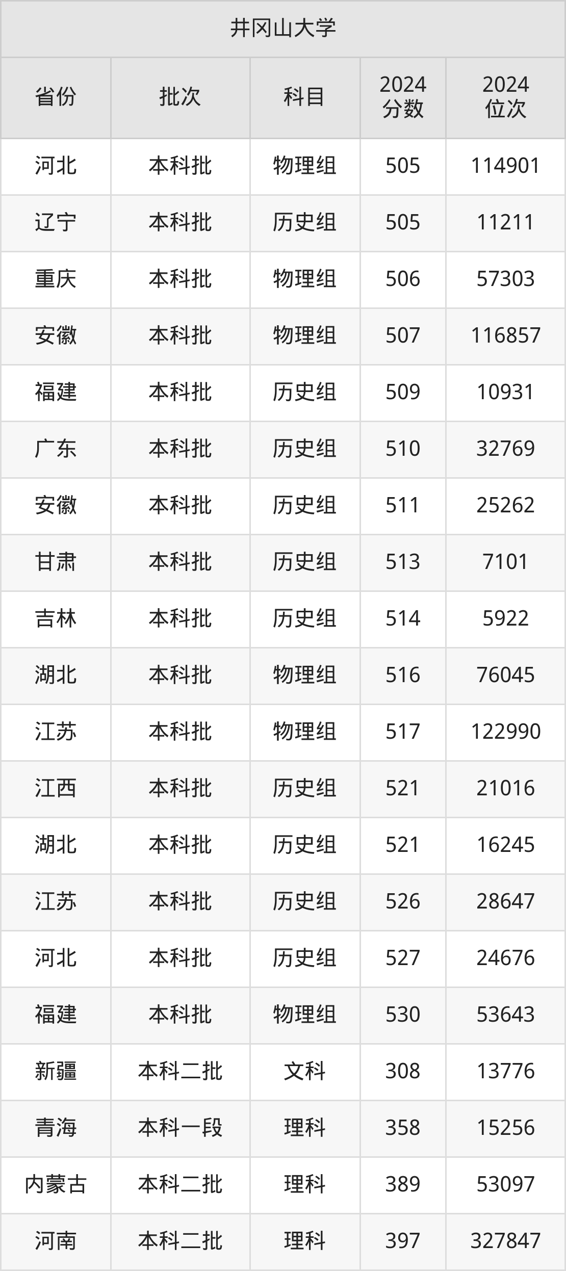 二、井冈山大学2024年录取分数线汇总