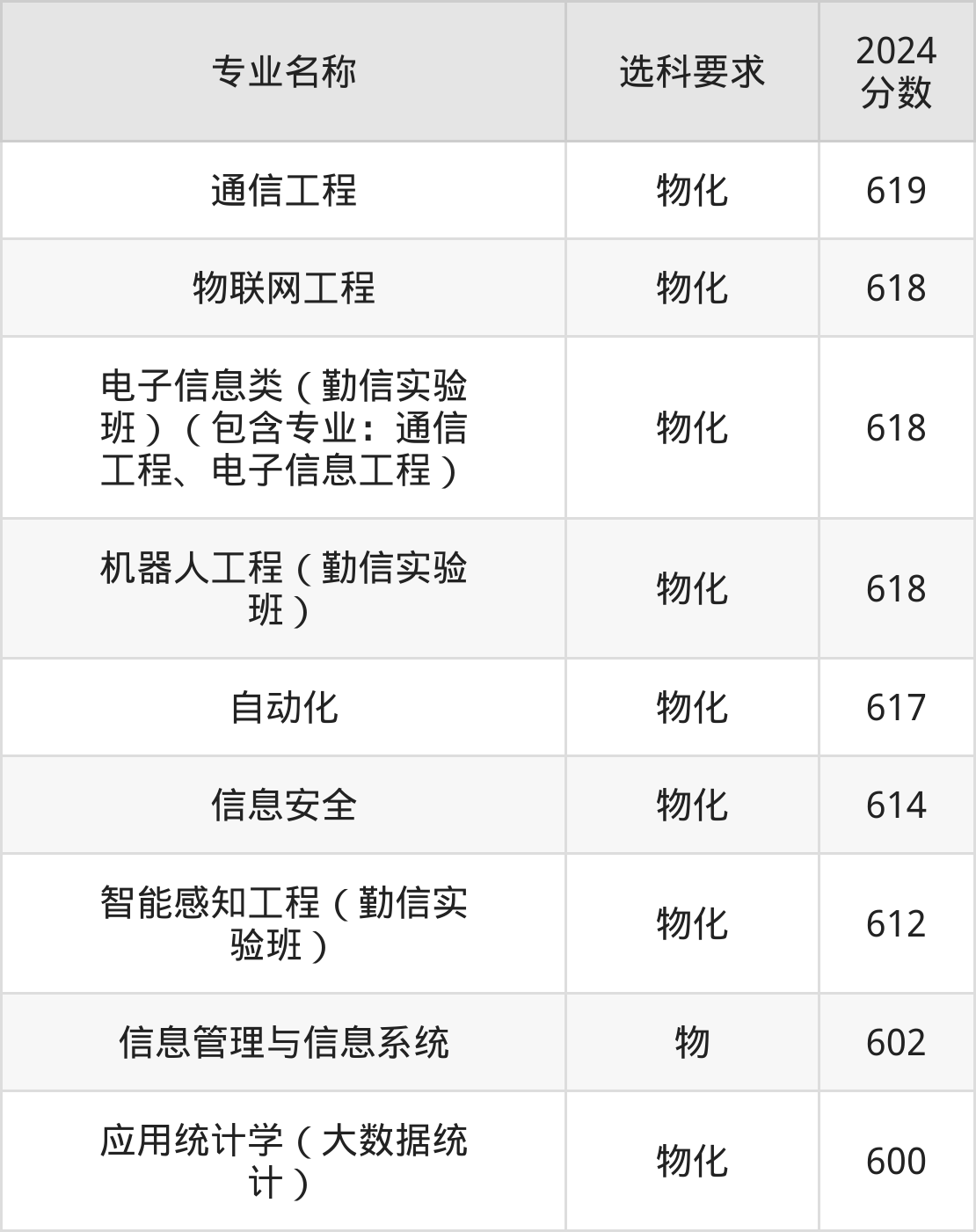 | 电子信息类(勤信实验 班)(包含专业:通信 工程、电子信息工程) | 物化 | 595 |