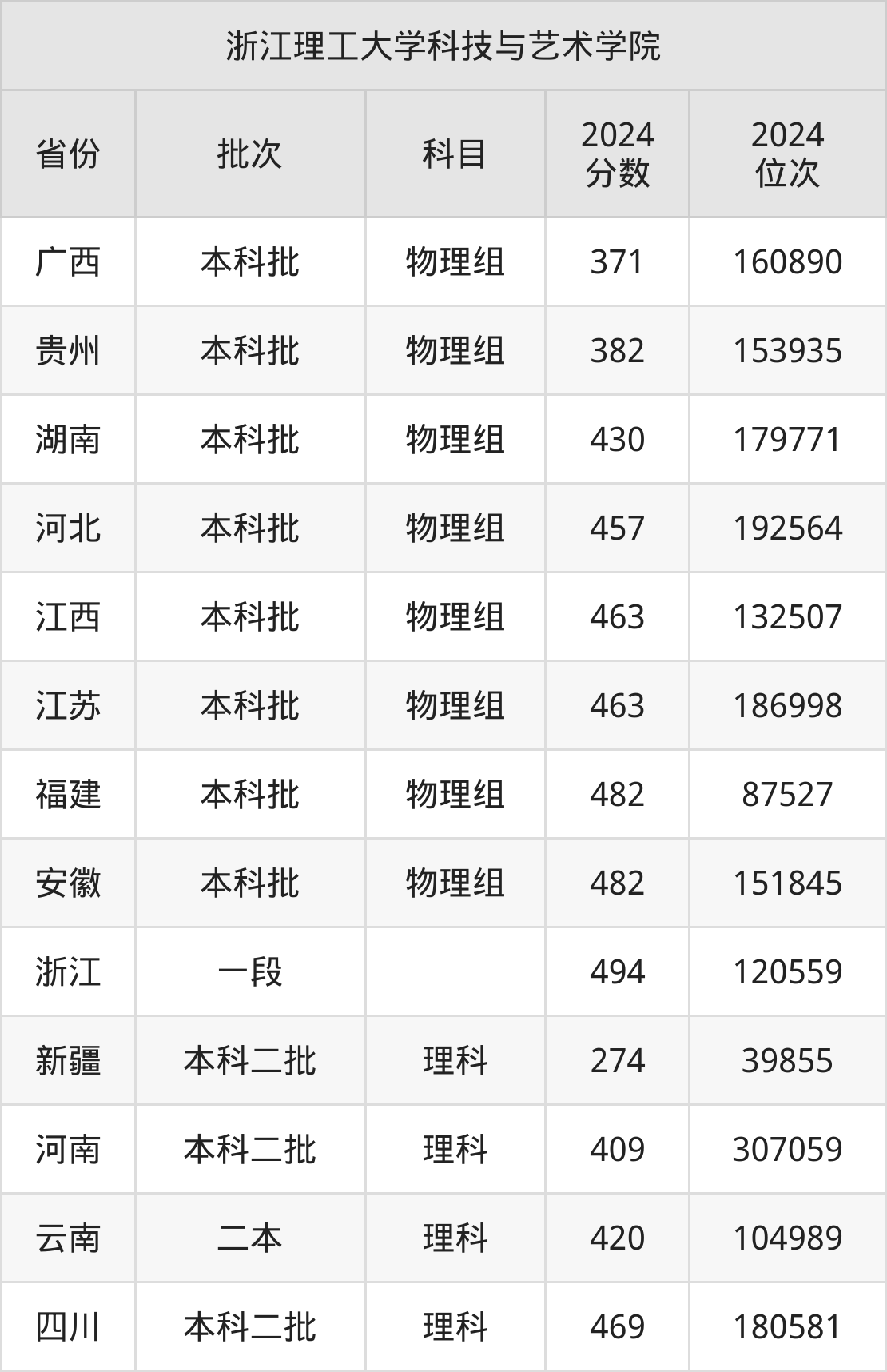 在广西本科批物理组,浙江理工大学科技与艺术学院的最低分是371、最低录取位次是160890名。在贵州本科批物理组,浙江理工大学科技与艺术学院的最低分是382、最低录取位次是153935名。